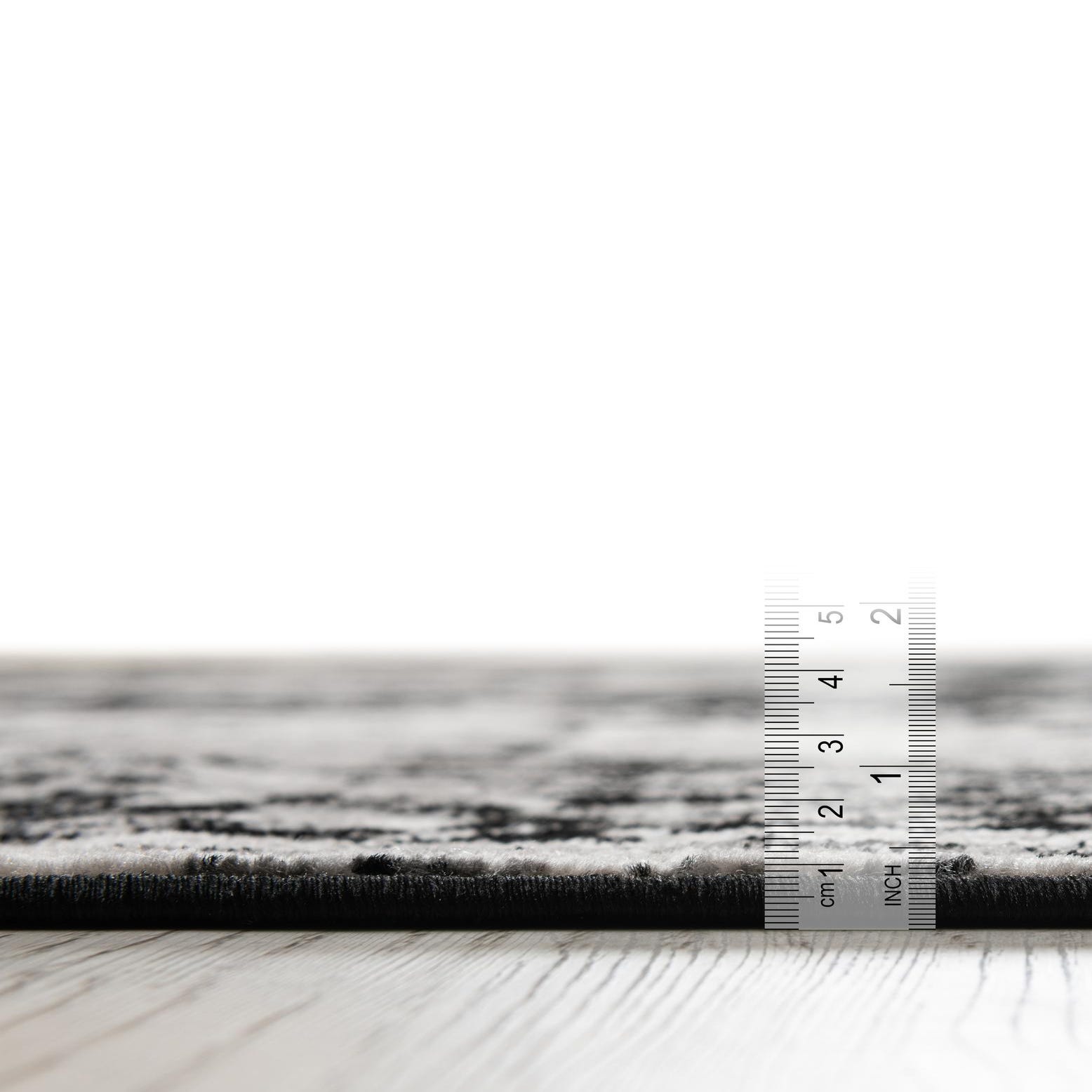 A worn-inspired medallion pattern sits on a deep black ground, with layers of mottled gray and ivory creating a lived-in, antique look. The classic border and central focal motif are deliberately distressed, producing an organic contrast between the darker background and the lighter decorative elements. Machine-made from 100% polypropylene, the surface has a low, dense pile with a slight sheen; when you glide your hand over it you feel a smooth, even texture that holds pattern detail while remaining practical for everyday use.