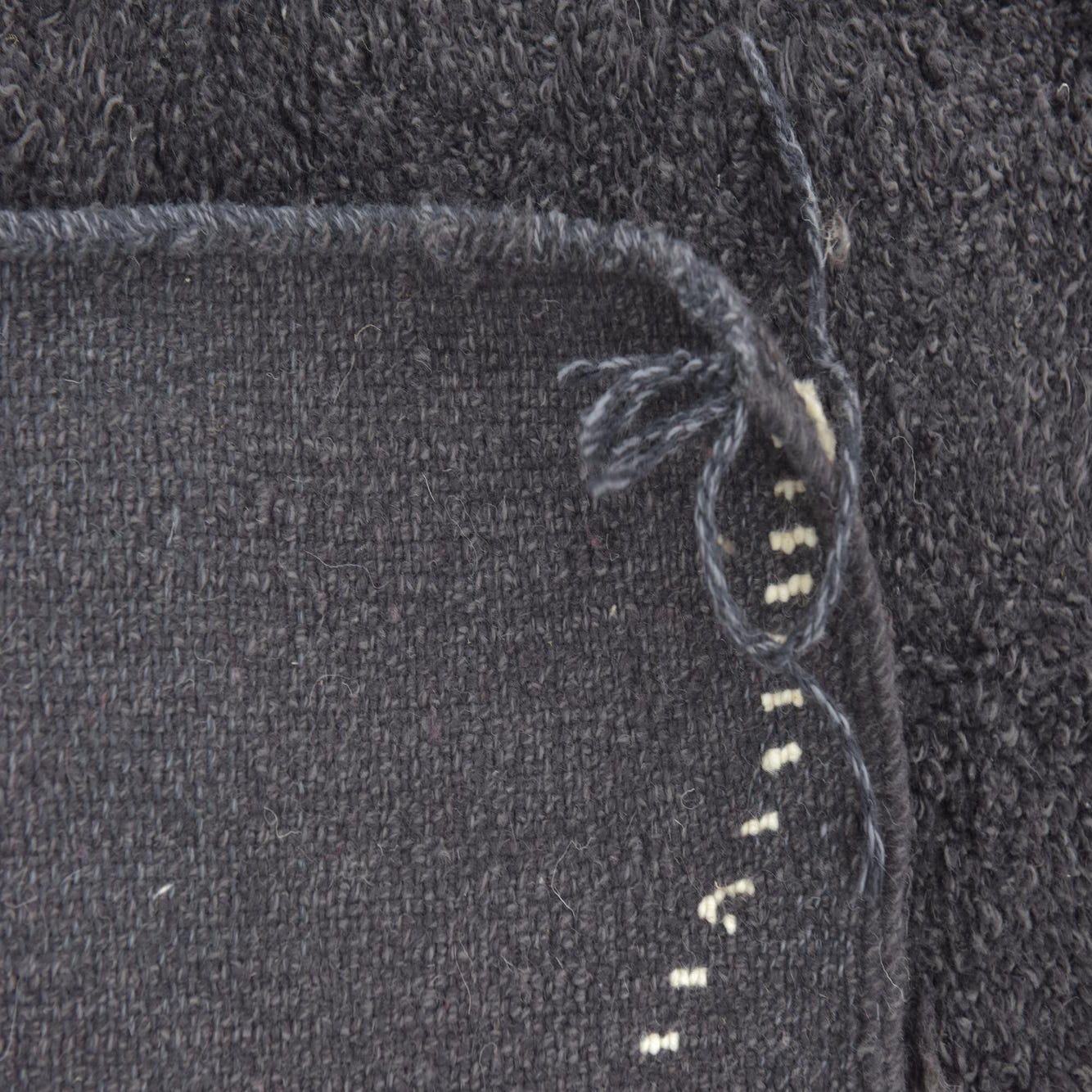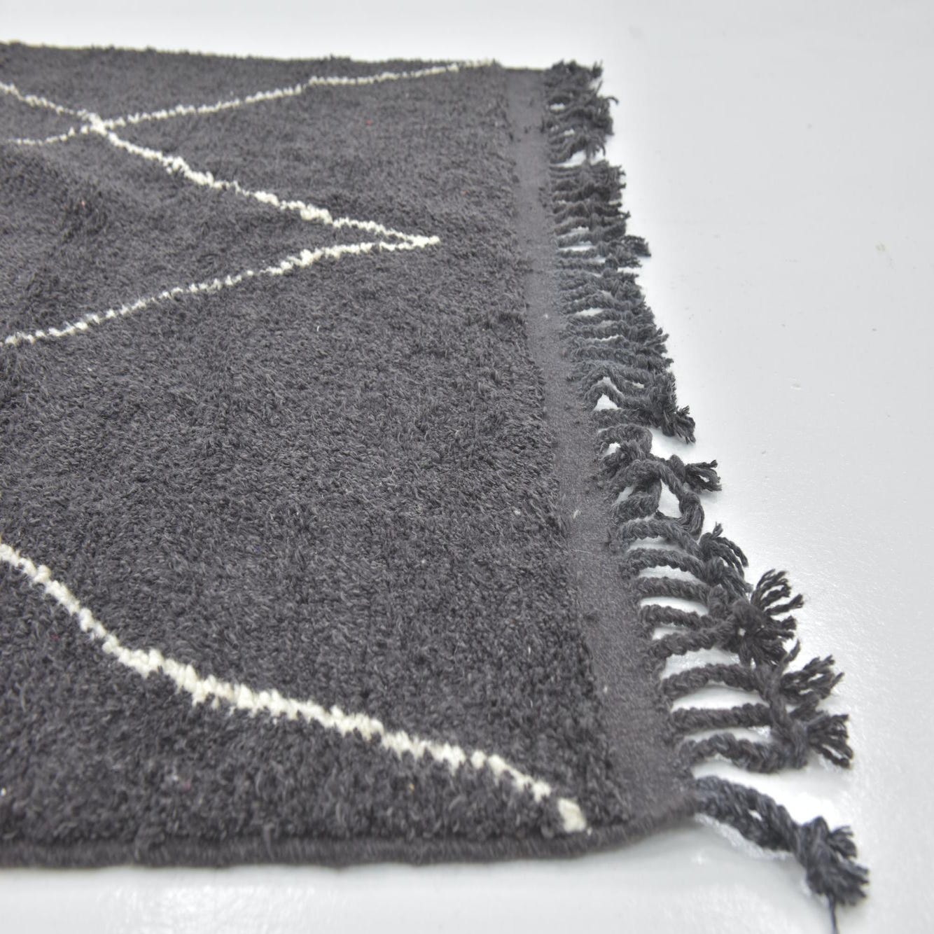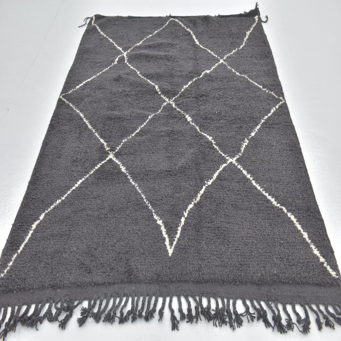This rug lends itself well to interiors that embrace a monochrome palette or seek to add visual impact through the use of contrasting elements. It would sit comfortably in modern, minimalist settings, as well as more eclectic or bohemian-styled spaces where its cultural heritage can be appreciated. The simplicity of the color scheme allows this rug to integrate seamlessly with both understated and bold decor choices, while its timeless pattern ensures enduring relevance in various design contexts.