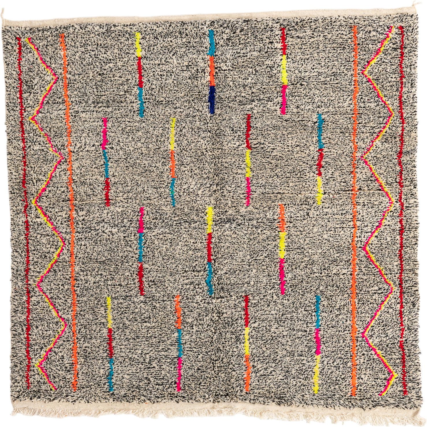 A 5x8 rectangular black shag rug with a tribal pattern featuring colorful vertical stripes and zigzag borders in neon pink, orange, yellow, and blue.