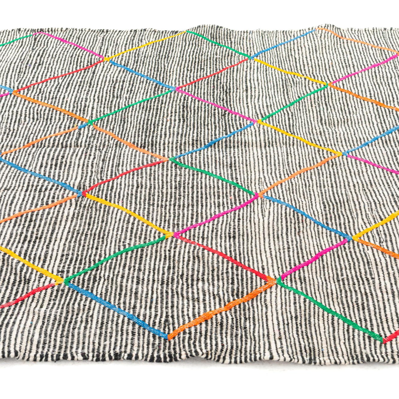 A 5x8 rectangular black and white tribal shag rug with a colorful diamond pattern, suitable for a living room.