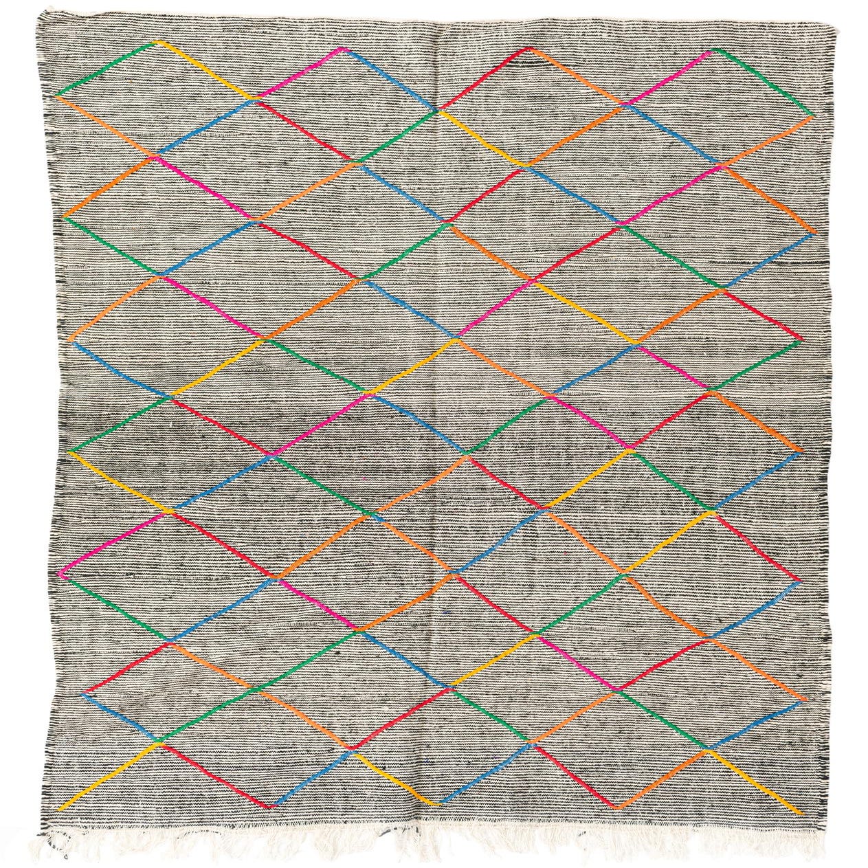 This Moroccan collection rug boasts a bold black background, overlaid with a captivating lattice pattern featuring a vibrant mix of colors, including black, blue, green, ivory, orange, red, purple, and pink. The semi-antique piece, hand-knotted from 100% wool, offers an authentic textural experience and durability, indicative of traditional craftsmanship spanning 40 to 60 years.