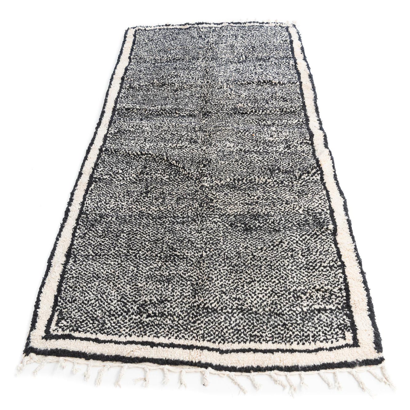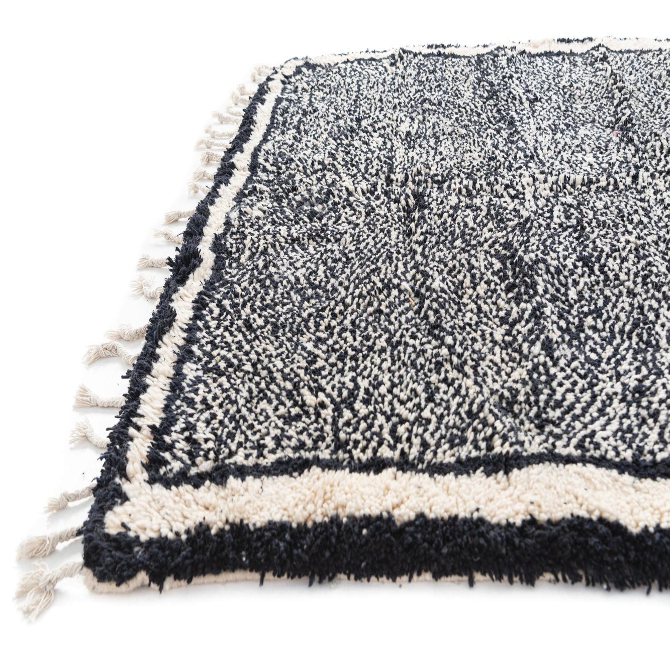 This Moroccan Collection rug presents a timeless charm through its hand-knotted craftsmanship and enduring wool construction. At 5x8, its dimensions are well-suited to a variety of spaces. The piece features a strong black background, complemented by ivory accents, creating a bold contrast that commands attention while maintaining a sense of balance and sophistication.