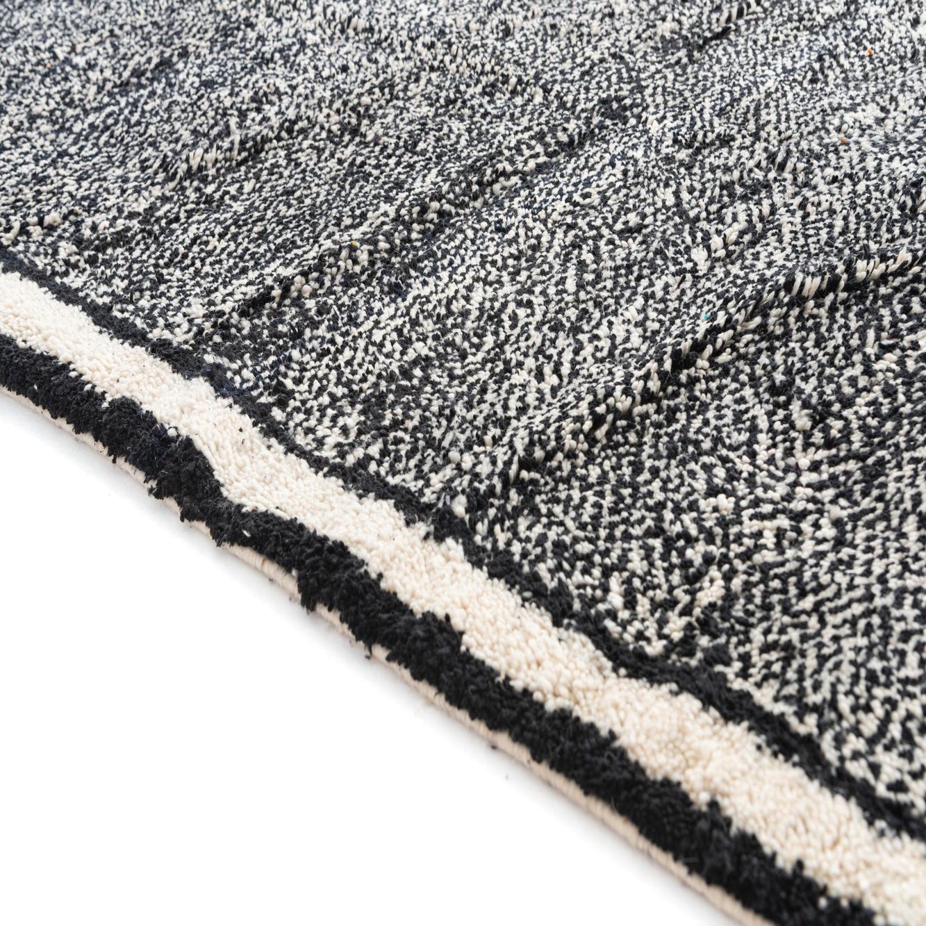 While its color palette is simple, the defined black and ivory scheme offers versatility in interior design applications. This rug would integrate seamlessly into a monochromatic setting or serve as an anchor point in a room with bolder colors. Its classic color combination and pattern are well-positioned to complement contemporary, minimalist, or Scandinavian-themed decors, but it could also serve as a grounding element amidst more eclectic or bohemian styles.