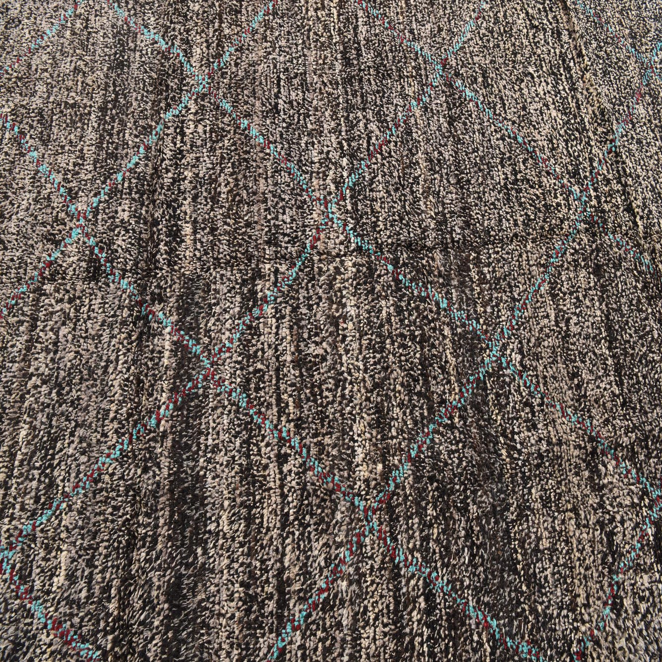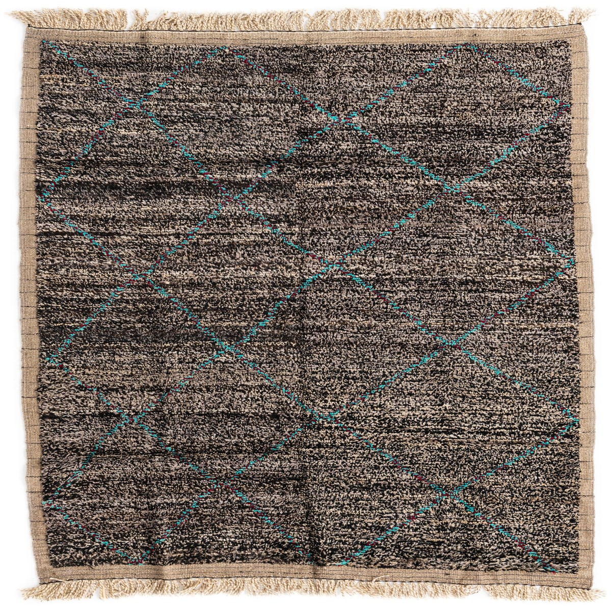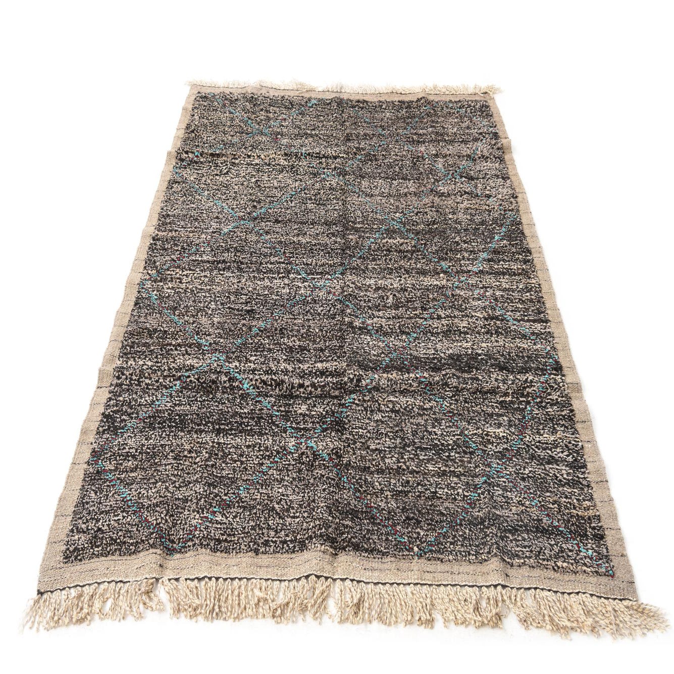 A 5x8 rectangular black shag rug with a subtle tribal diamond pattern in turquoise and red, featuring natural fringed edges.