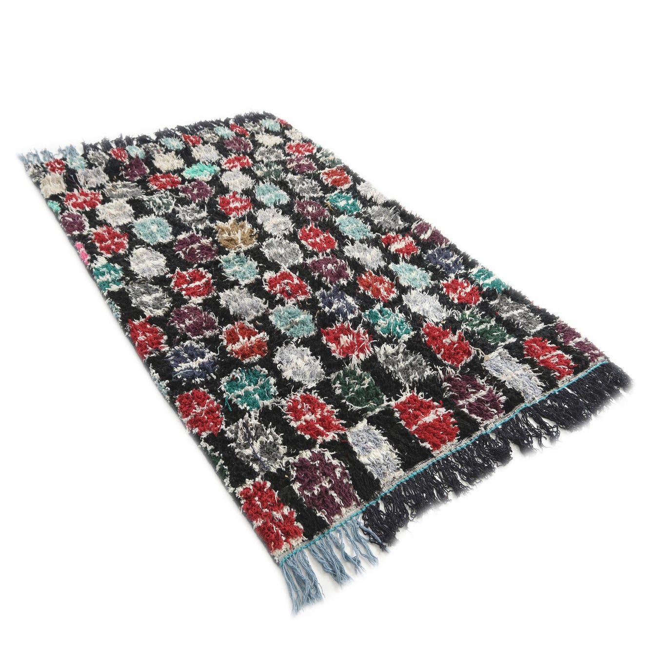 A 5x8 rectangular black shag rug with a vibrant tribal pattern of colorful squares in red, blue, green, and gray.