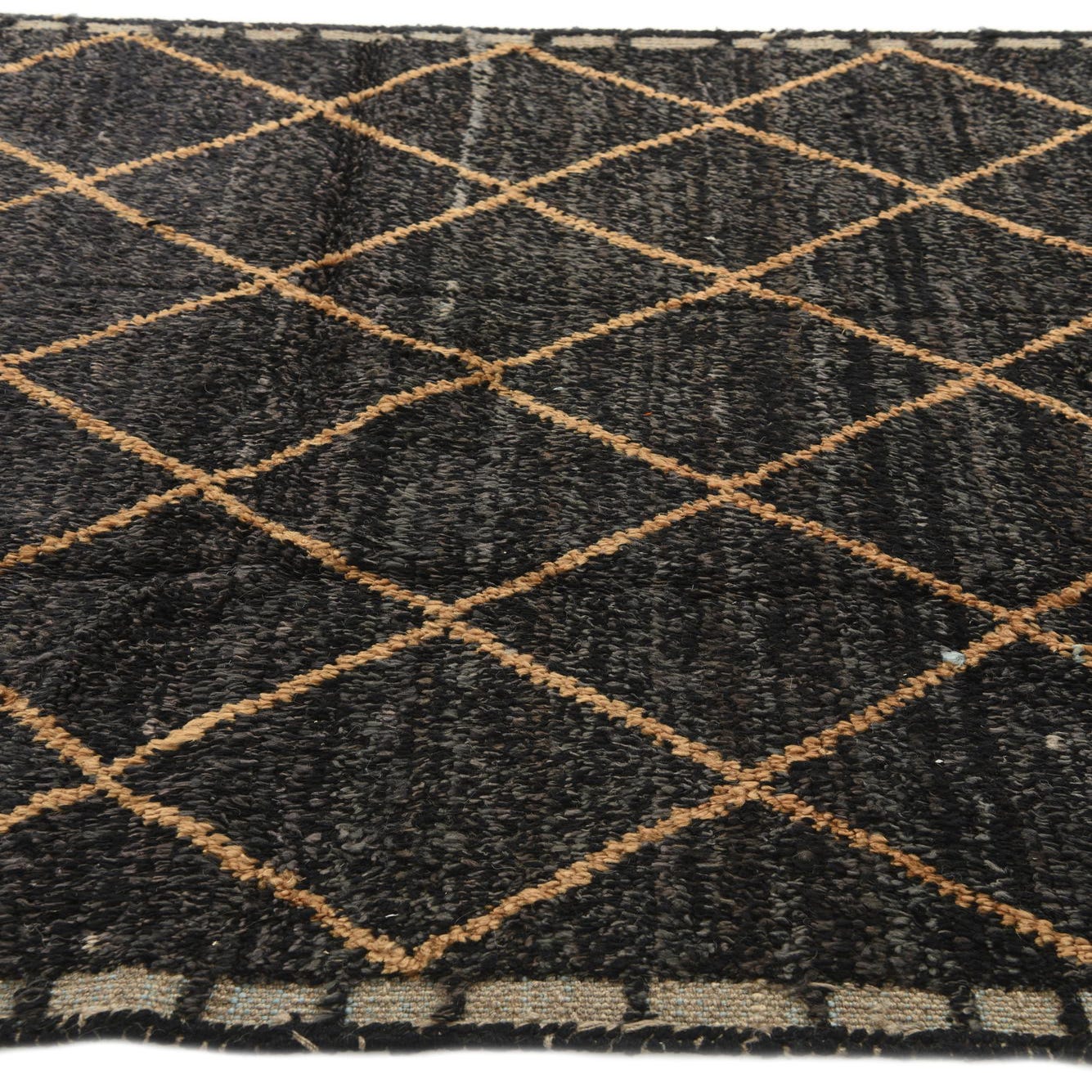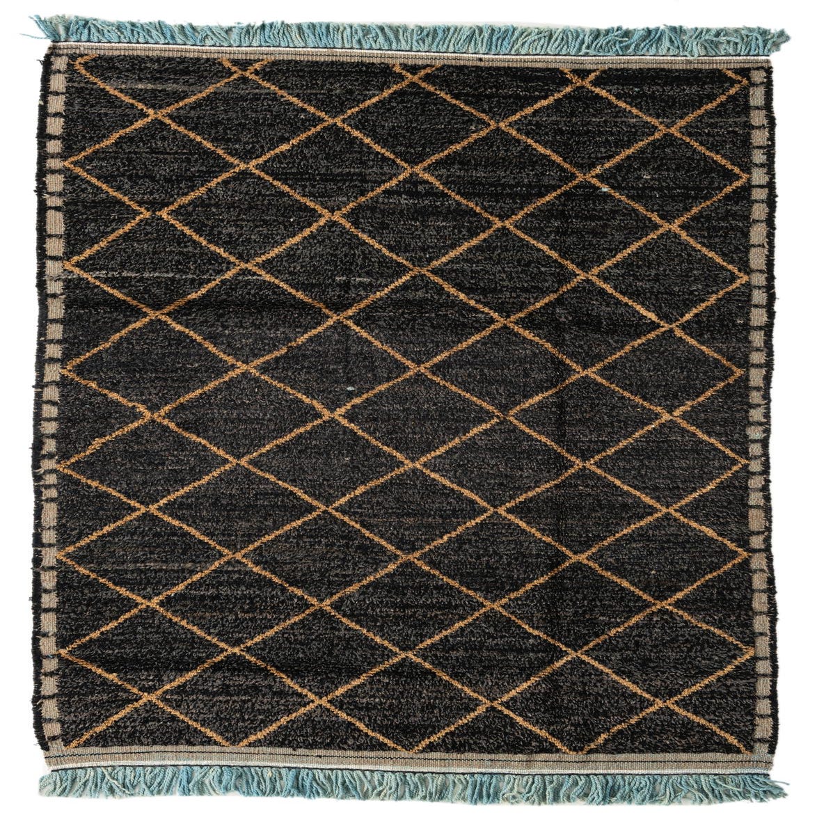 This Moroccan collection rug, hand-knotted of 100% wool, presents a harmonious blend of black, gold, and gray colors. The black background is boldly complemented by the geometric pattern of interlocking diamonds in gold, offering a visually impactful design. At 5x8 feet, the rug provides ample coverage, creating a focal point for medium-sized rooms. The textures of hand-knotted wool add depth and tactile appeal to the surface, while the fringe detailing on the ends provides a classic finishing touch.