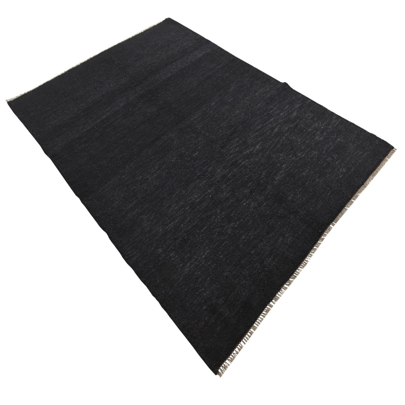 A 5x8 rectangular black shag rug with subtle tribal patterns, suitable for a living room or bedroom.