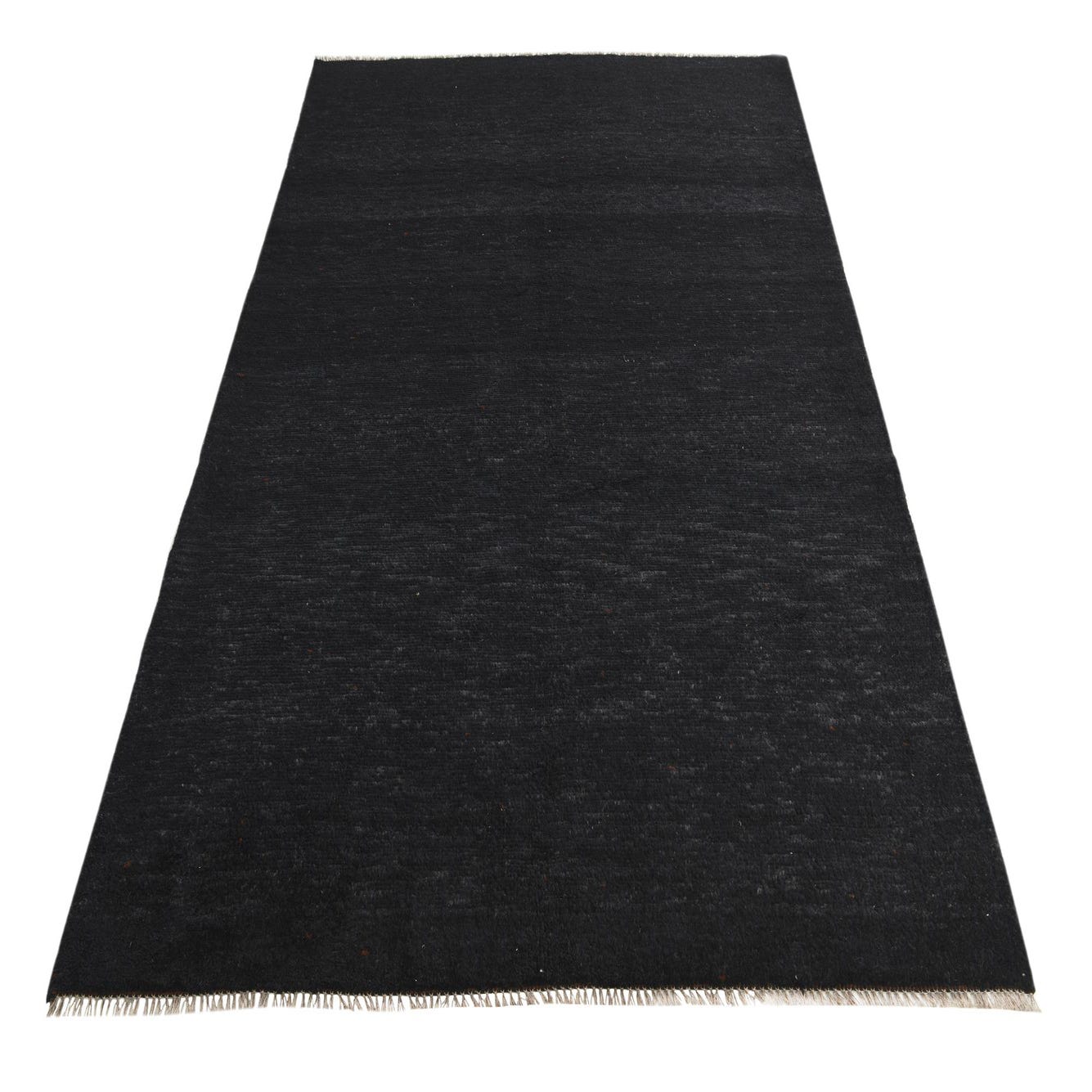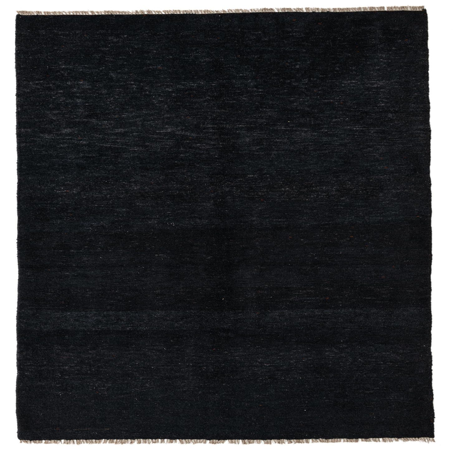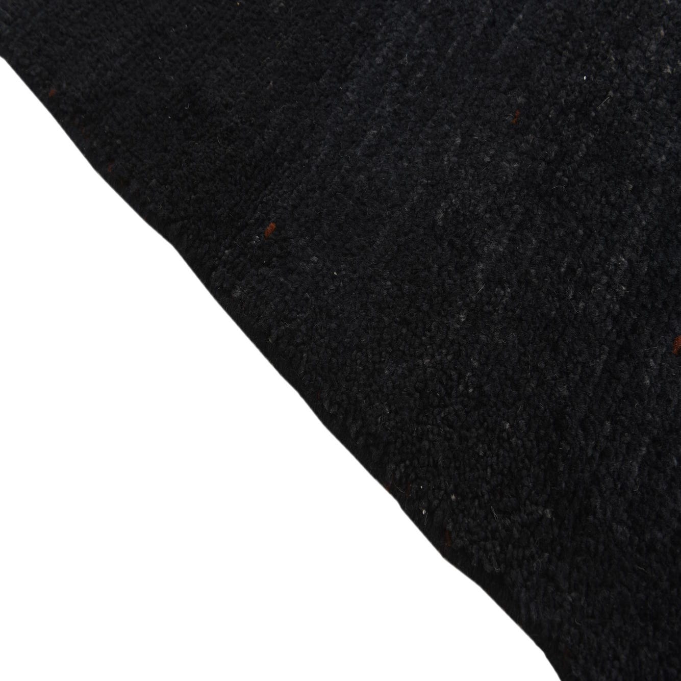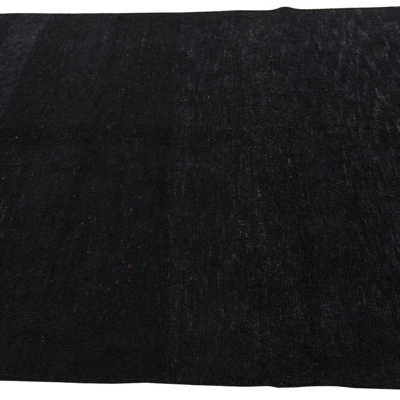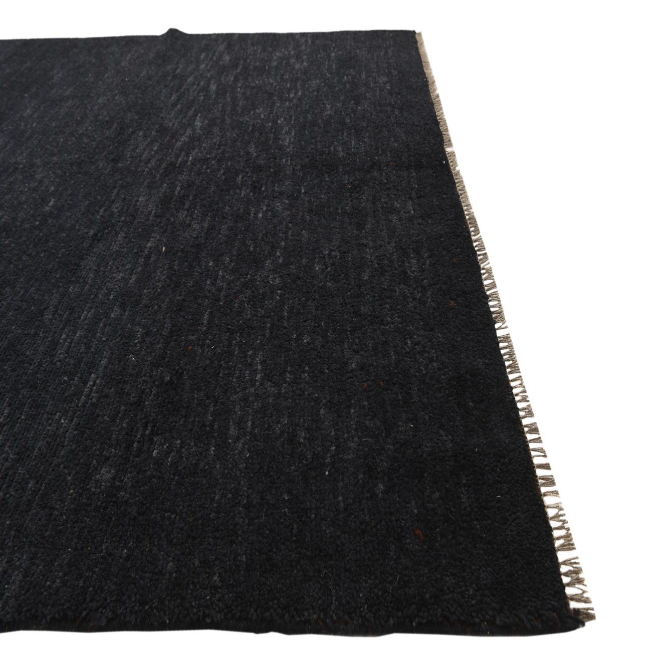 This Moroccan collection rug is a stylish and versatile piece, hand-knotted of 100% wool and measuring 5x8 feet in dimension. It showcases a minimalist pattern, allowing the rich texture and deep black background color to become the focal point of its design. The rug further features fringe detailing at both ends, adding a traditional flair.