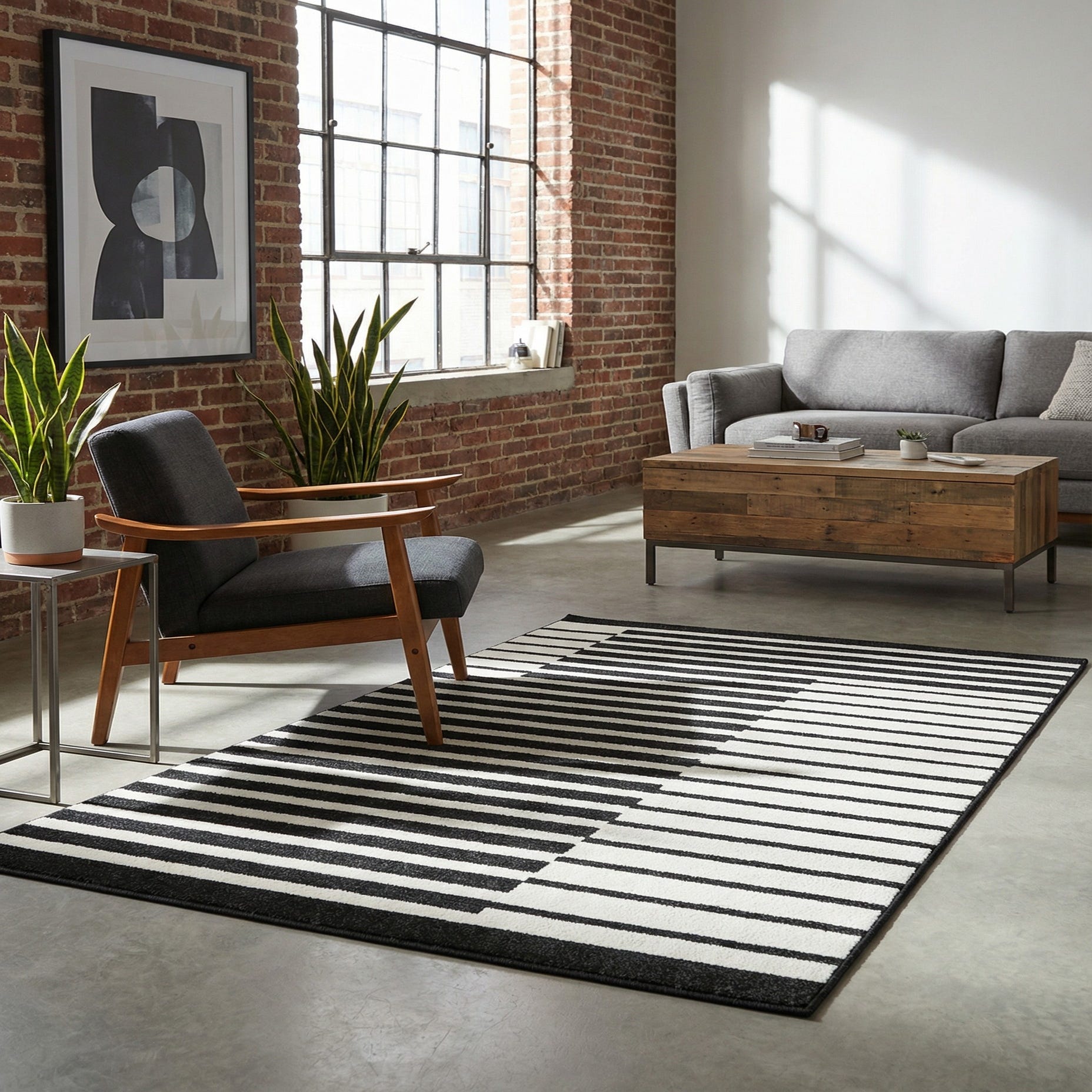 This rug works well in modern and minimalist schemes as a visual anchor beneath a coffee table or sofa, and it pairs naturally with light woods, metal accents, and streamlined furniture. It also complements mid-century modern and industrial loft settings—use it to define a dining area, bring contrast to a neutral bedroom, or ground a home office for a crisp, organized look.
