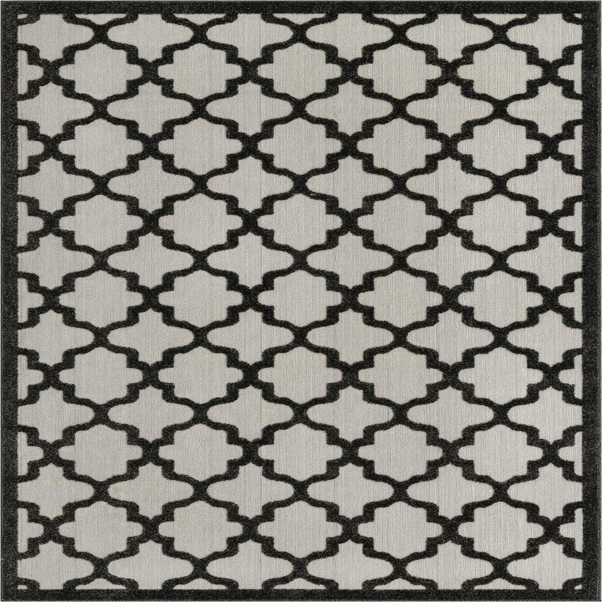 A 5x8 rectangular black and white trellis pattern rug with a flat, textured pile, suitable for indoor or outdoor use.