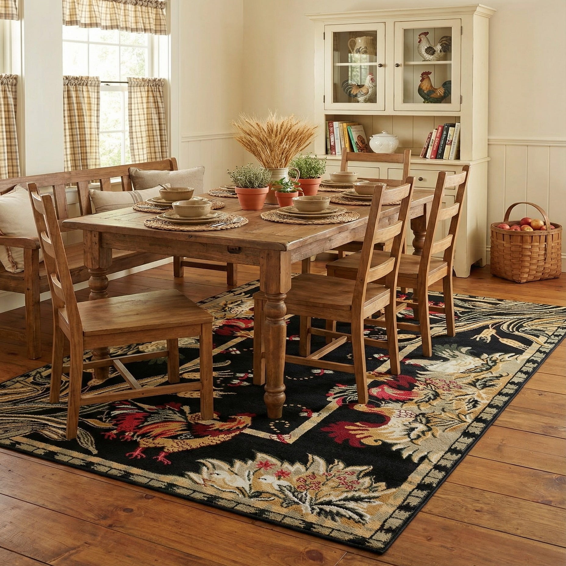 Run your hand across the surface and you’ll feel a low, dense pile made from 100% polypropylene that offers a smooth, slightly cushioned underfoot texture. The machine-made construction keeps the pattern crisp and the colors well-defined, making this rug a practical decorative anchor. It pairs naturally with farmhouse and country-style kitchens, a breakfast nook or an entryway where the dark background hides wear while the warm palette complements oak or pine floors. It also works as a lively accent in a living room with leather seating and matte-black hardware, or layered beneath a rustic dining table to pull together reds, tans and olive tones in the room.