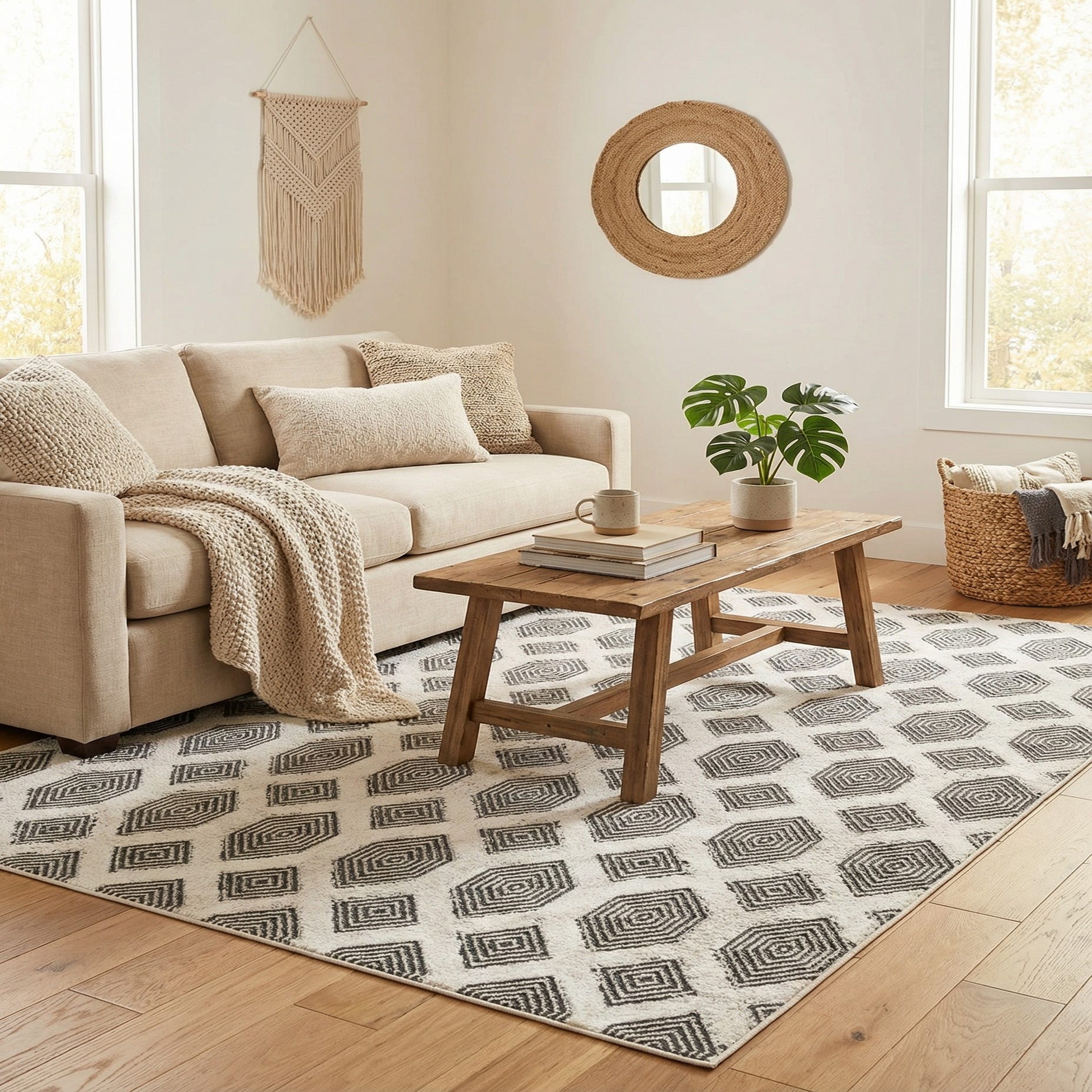 This rug works well as an anchor in a monochrome living room, layered over warm wood floors or tucked beneath a low-profile sofa to define the seating area. It also complements minimalist and mid-century schemes, or adds contrast in an industrial loft or contemporary bedroom. Because of its graphic pattern and neutral palette, it pairs easily with natural linens, black metal accents, and warm wood tones for a balanced, modern look.
