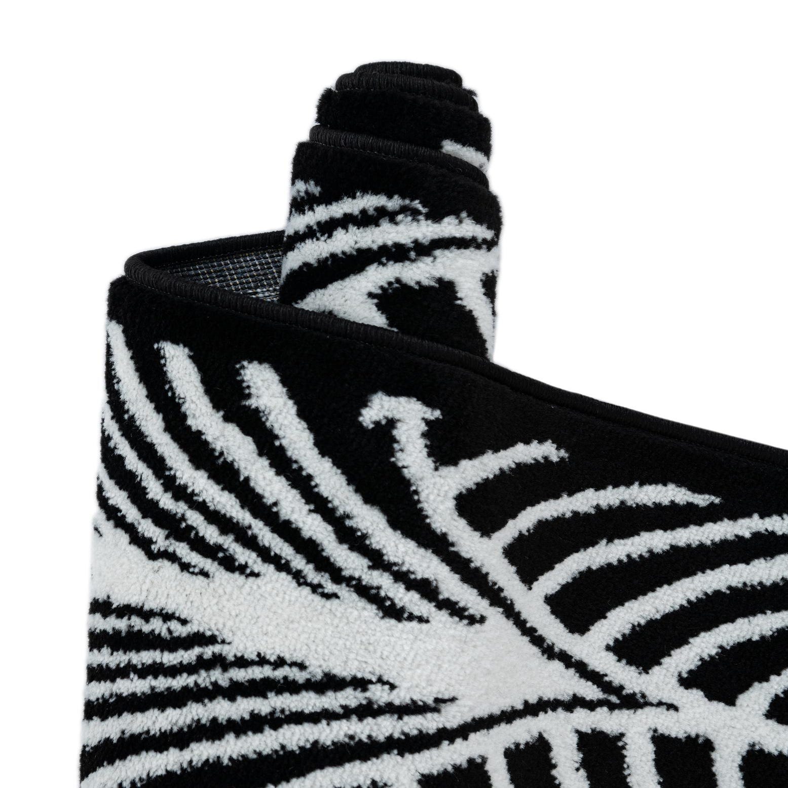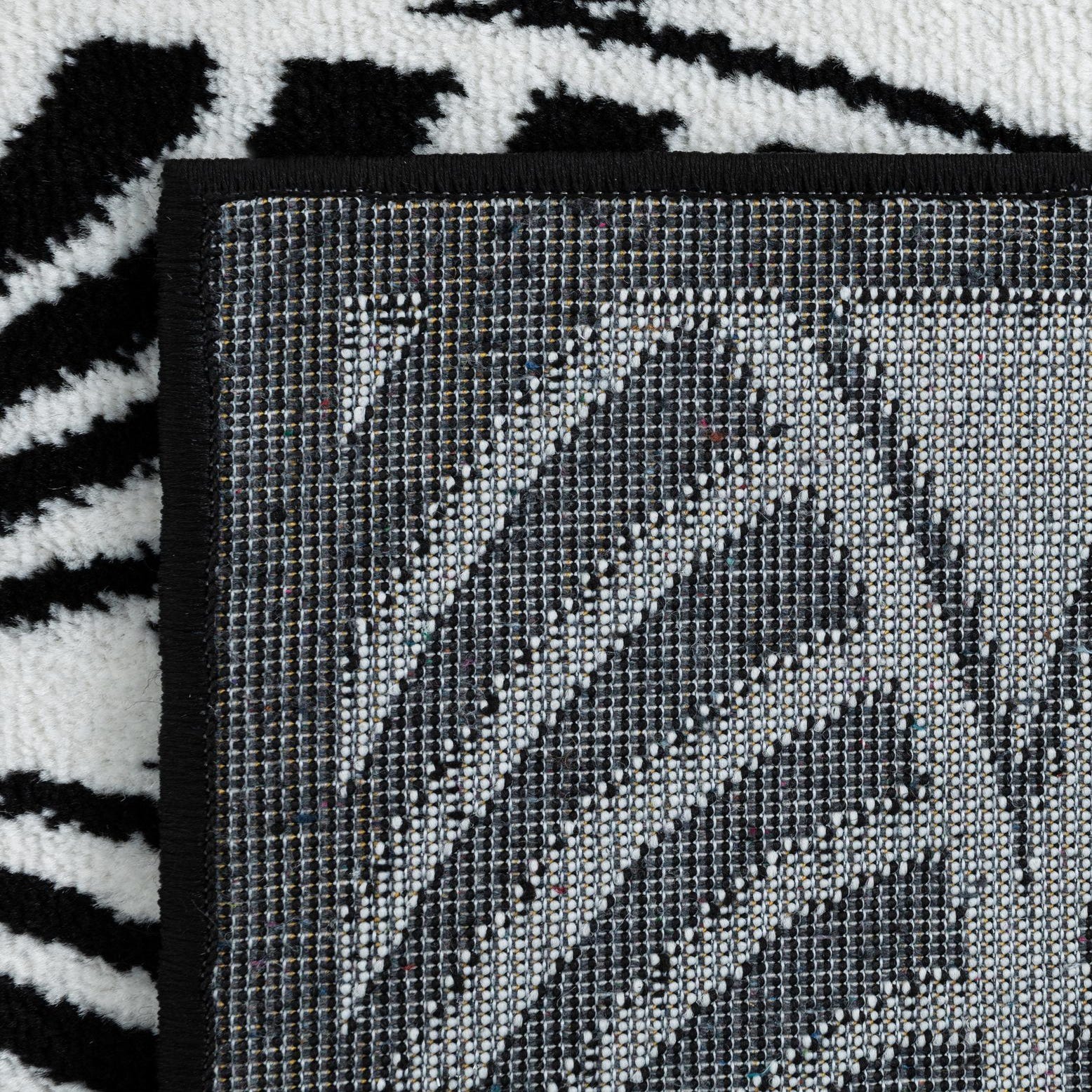 This rug works well in modern and transitional interiors where high-contrast accents lift the scheme—place it beneath a low coffee table to anchor a monochrome living room, layer it in a dining area under a light wood or glass table to add graphic interest, or use it in a home office to introduce pattern without overwhelming the space. It pairs nicely with metal and wood finishes, clean-lined furniture, and textiles in solid neutrals or single, bold accent colors.