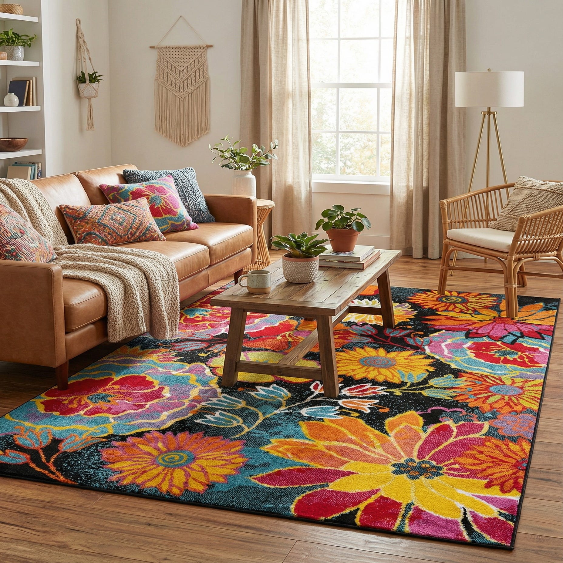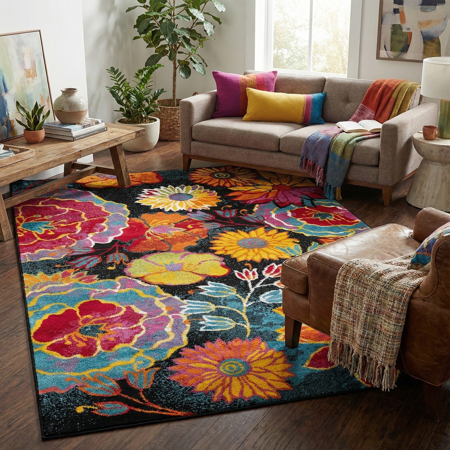 Machine-made from 100% polypropylene, the rug has a dense, low-to-medium pile that feels softly cushioned and slightly springy underfoot, with clearly defined edges and bright color saturation. Place it under a living room sofa to anchor a modern seating group, layer it in an eclectic bedroom with mixed textiles and artwork, or use it in a lively dining area to inject pattern and warmth. It also pairs well with mid-century modern furnishings or a neutral minimalist palette when you want a confident pop of color.
