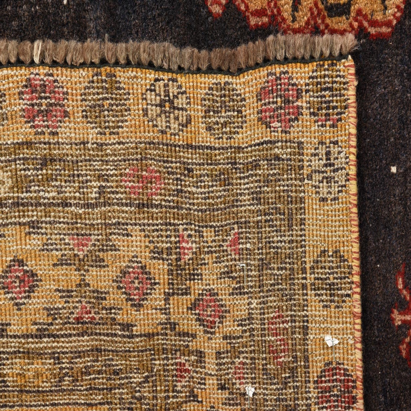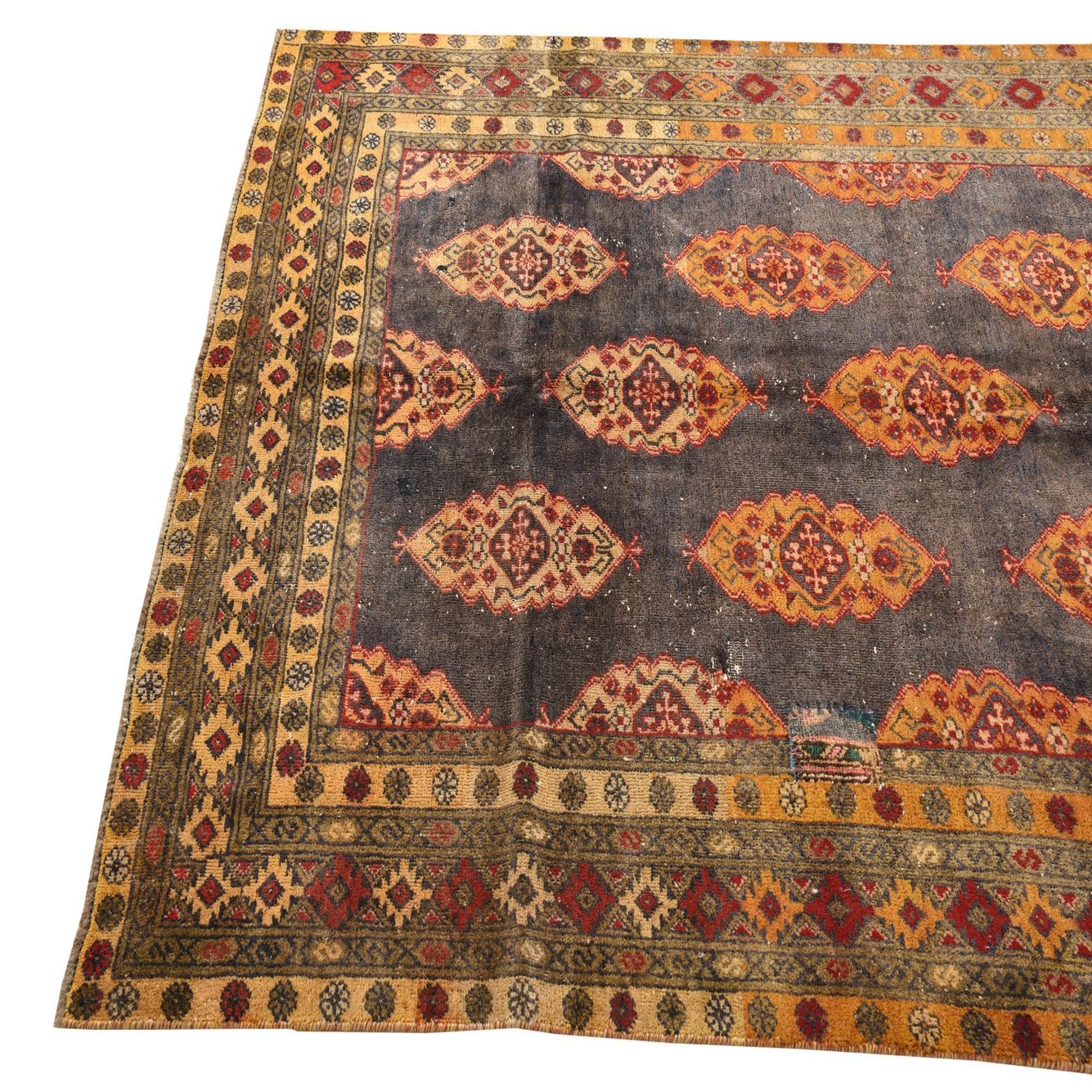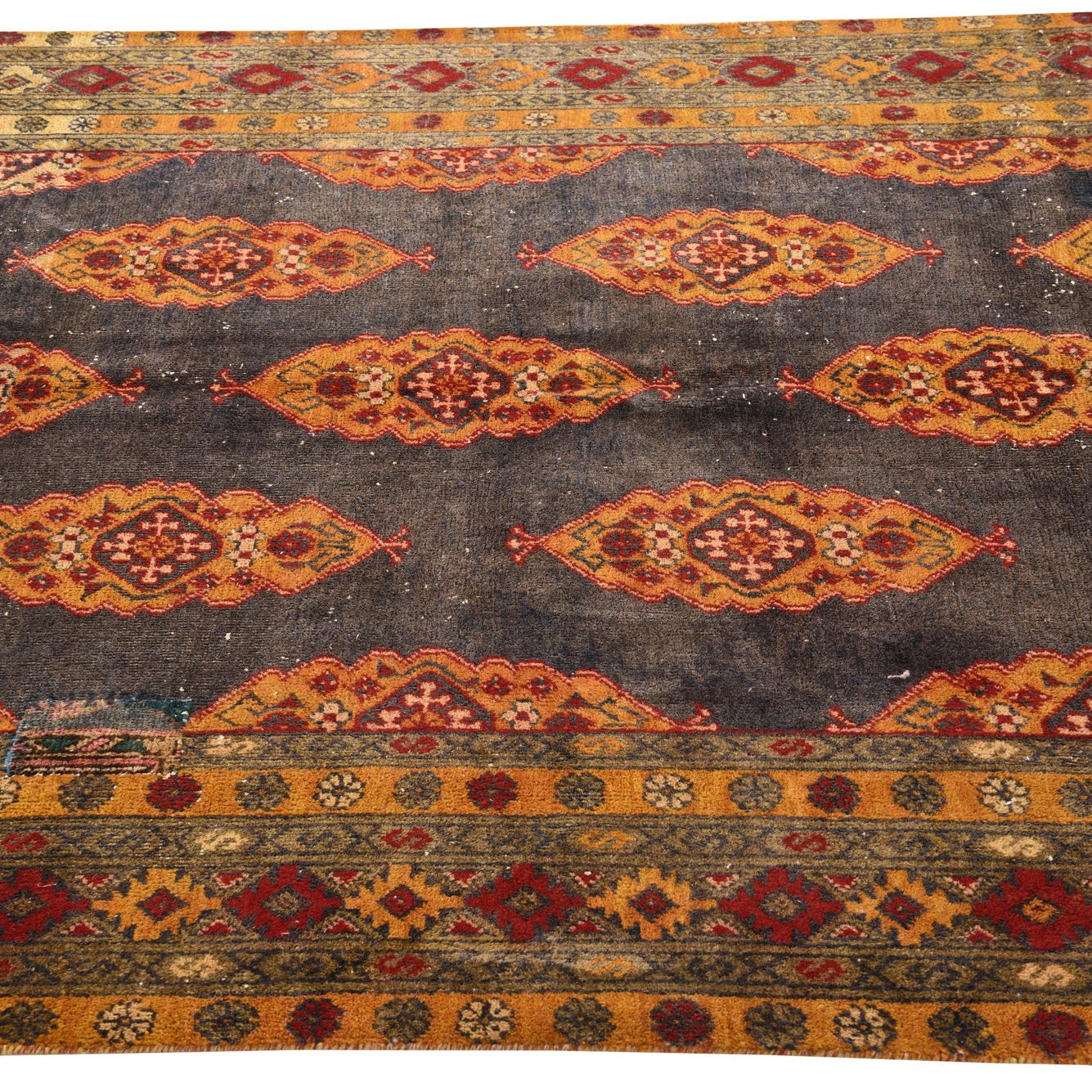 The border of the rug presents a complementary series of geometric motifs that frame the piece, enhancing its overall appeal. With a low pile, this rug exhibits signs of age through its subtle wear and expert repairs, contributing to its authentic semi-antique character (aged 40-60 years old). The presence of fringes on each end adds to its traditional aesthetic.