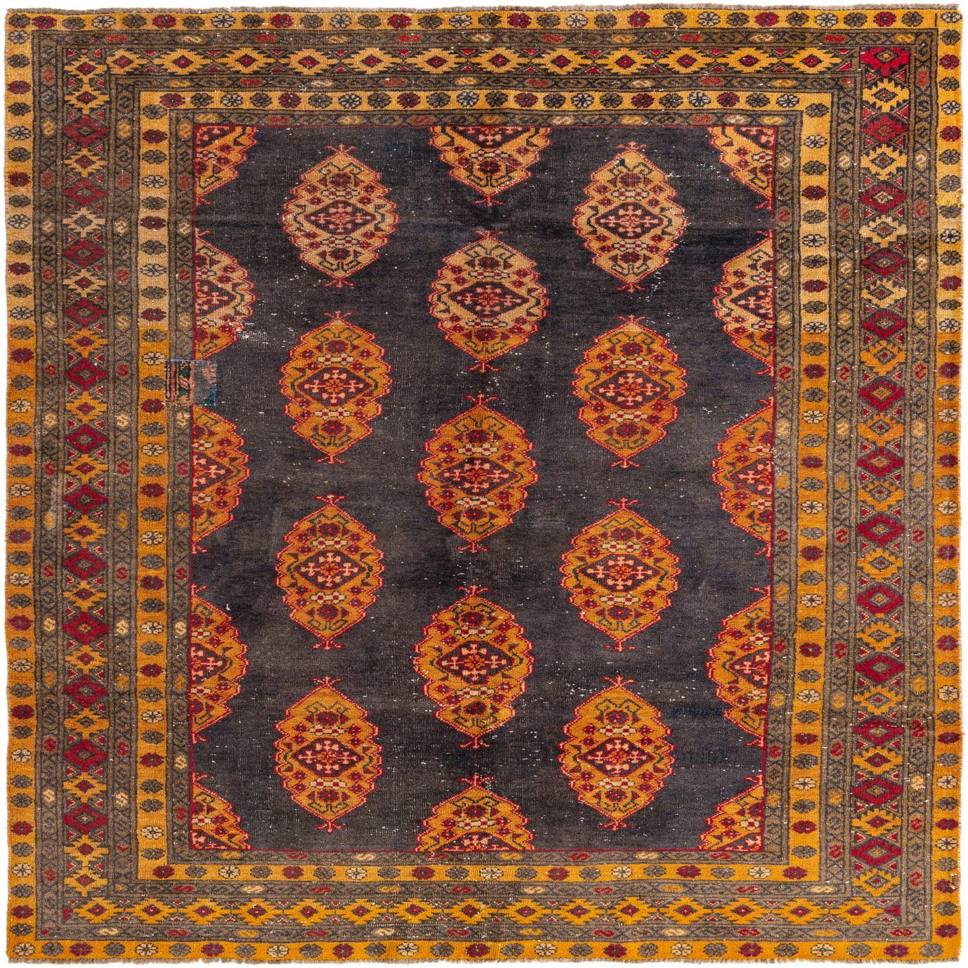 This Ultra Vintage collection rug showcases the timeless charm of hand-knotted craftsmanship, crafted from 100% wool. The rug, measuring 5x8 feet, features a rich black background highlighted by a compelling pattern in gold, ivory, red, and brown hues. Symmetrical medallions gracefully adorn the field, providing a classic and opulent touch to the design.