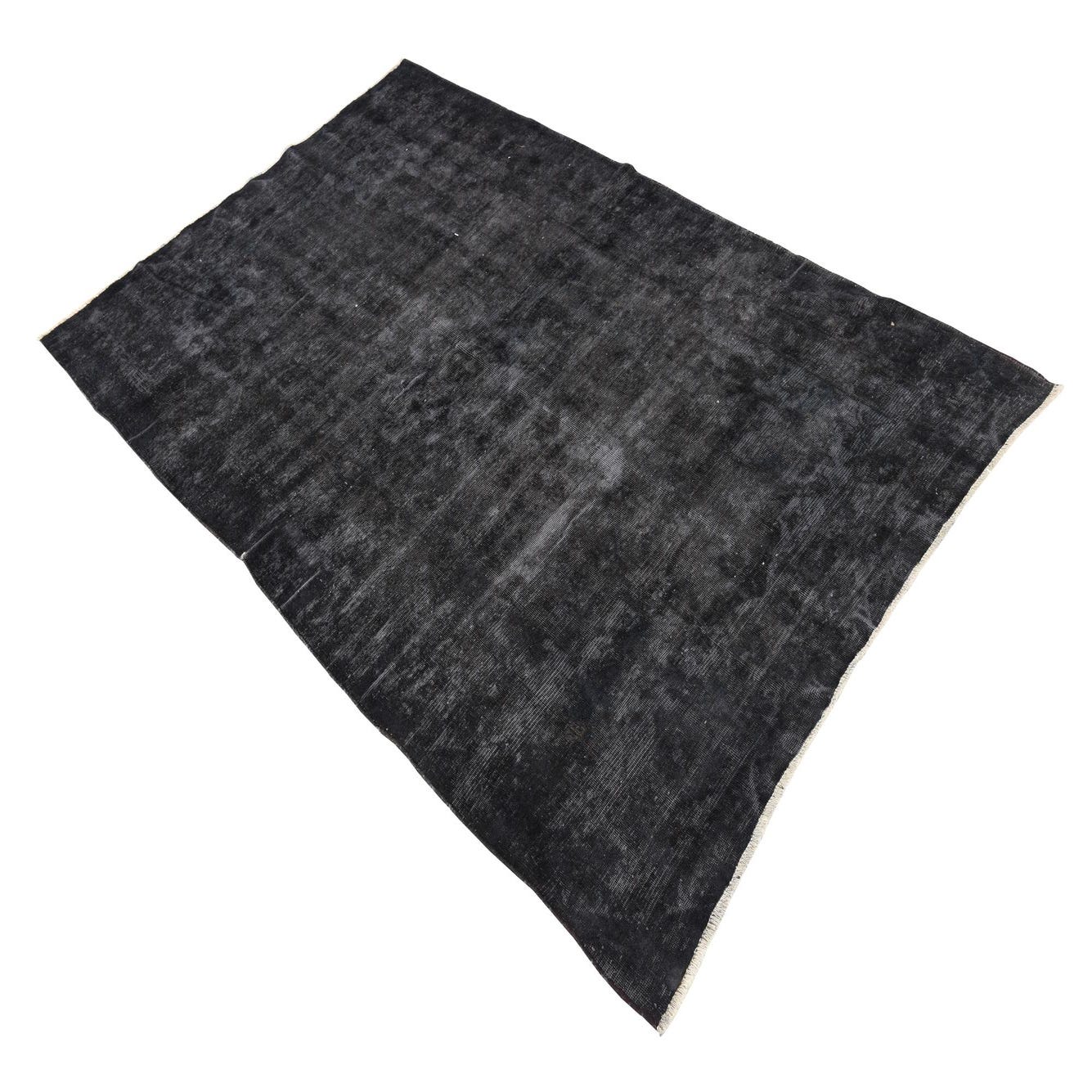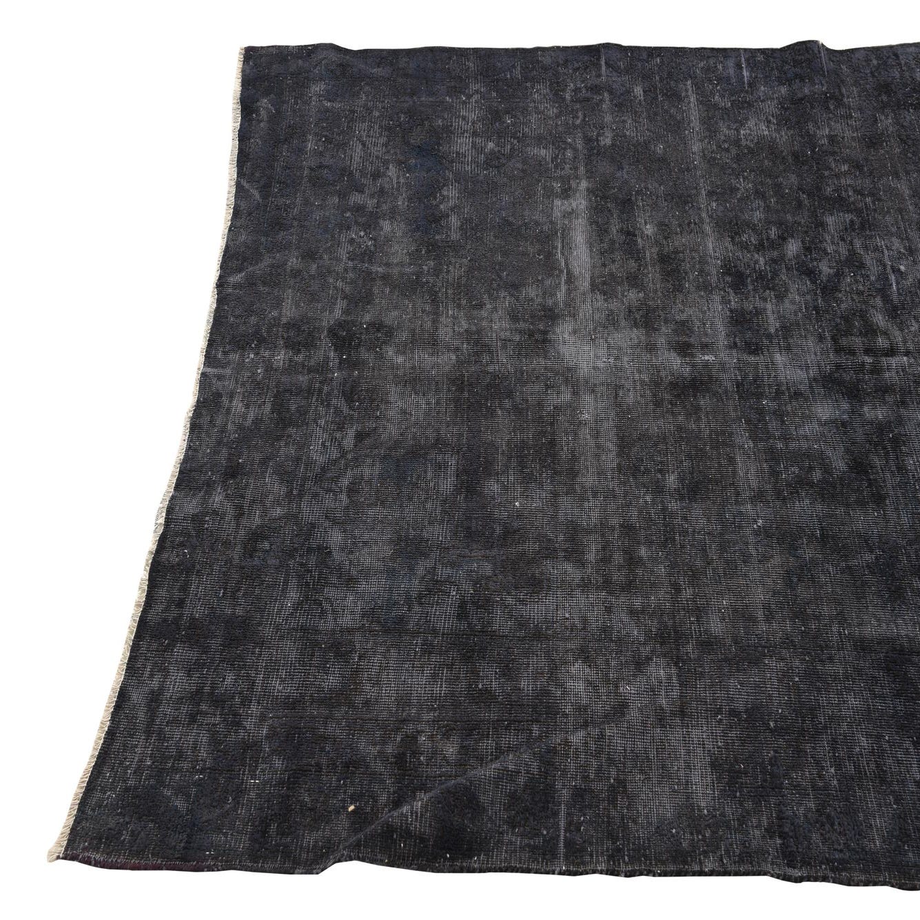 A 5x8 rectangular black Persian-style wool rug with a distressed vintage pattern and short white fringes.