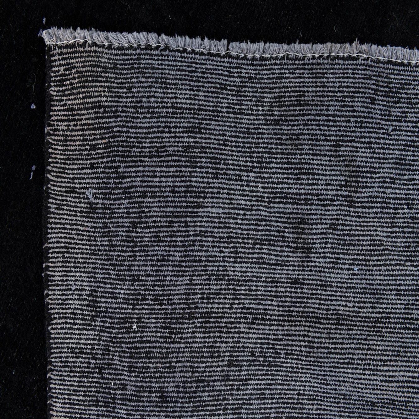 A 5x8 rectangular black wool rug with a subtle, distressed vintage Persian pattern, suitable for a living room.