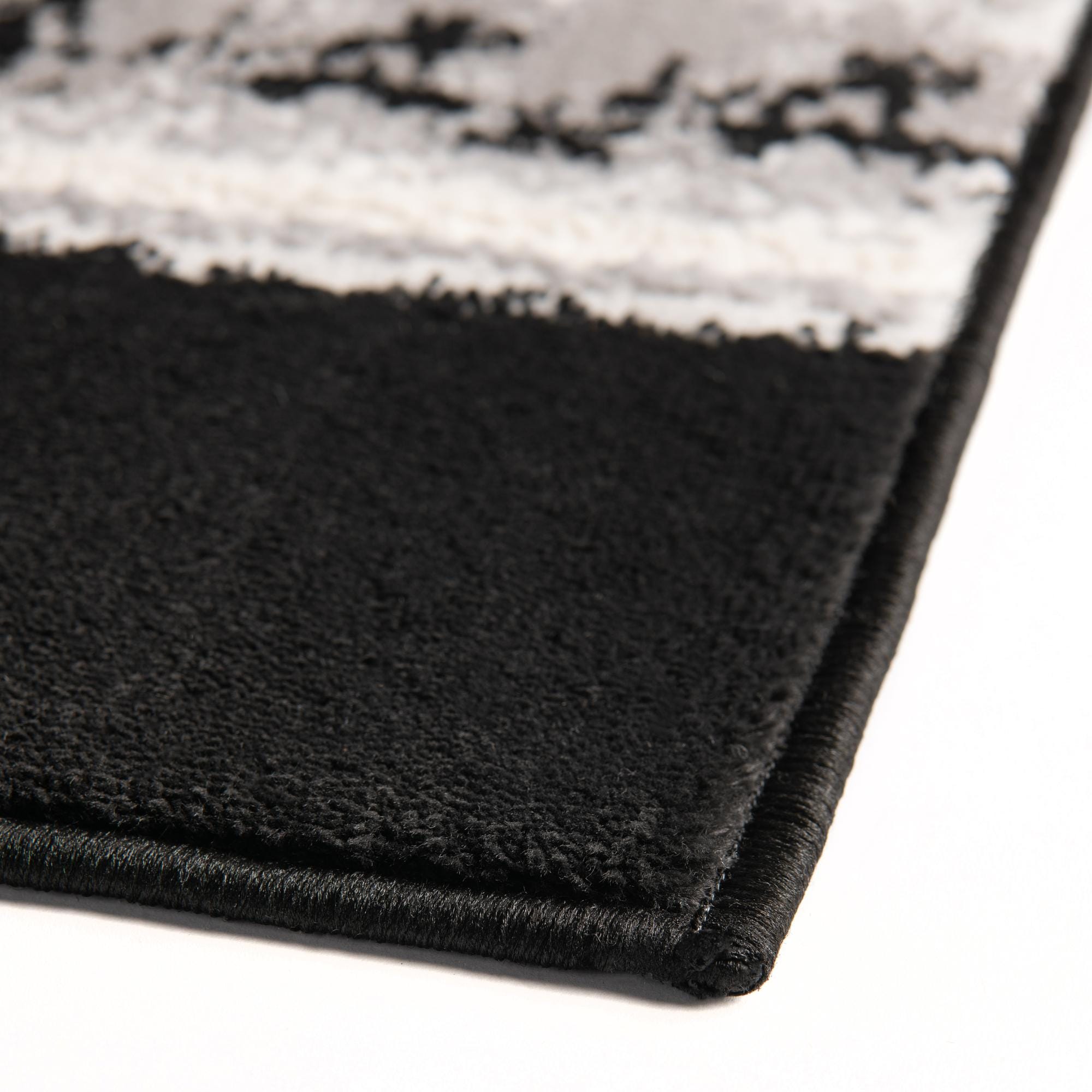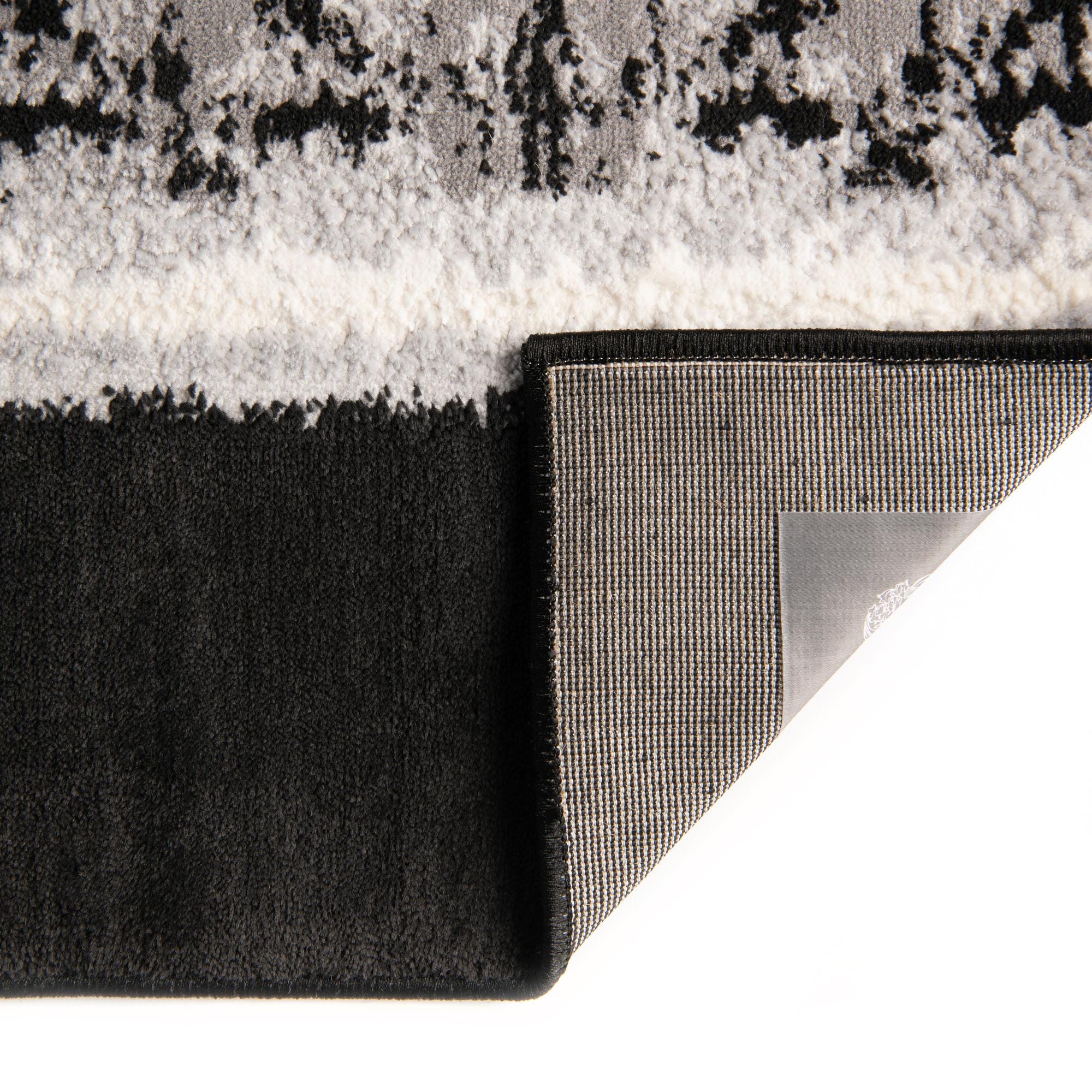 Primary color is Black. Colors in this rug include: Black, Gray, Ivory.