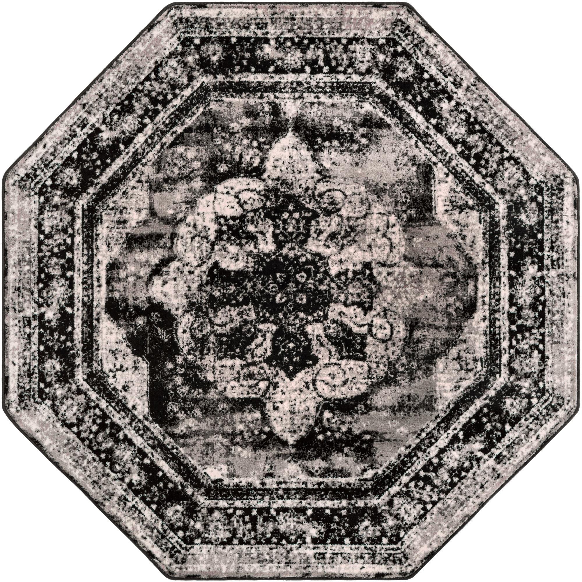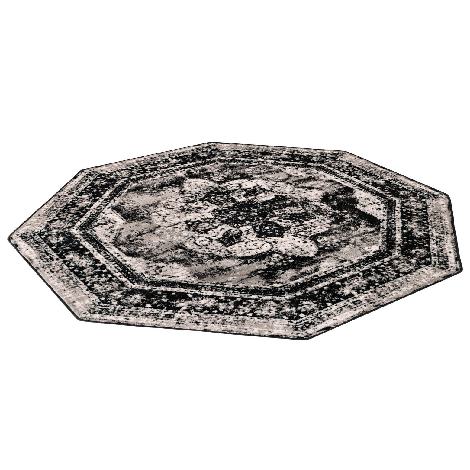 The Monte Carlo Collection presents a 6 Ft Octagon rug crafted from 100% Polypropylene, known for its durability and ease of care. This piece features a dominant black background, complemented by a grayscale palette that includes shades of gray and ivory. The rug showcases a distressed pattern that offers the elegant appeal of traditional designs, while the color variation provides a contemporary twist, making it versatile for a variety of decor themes.