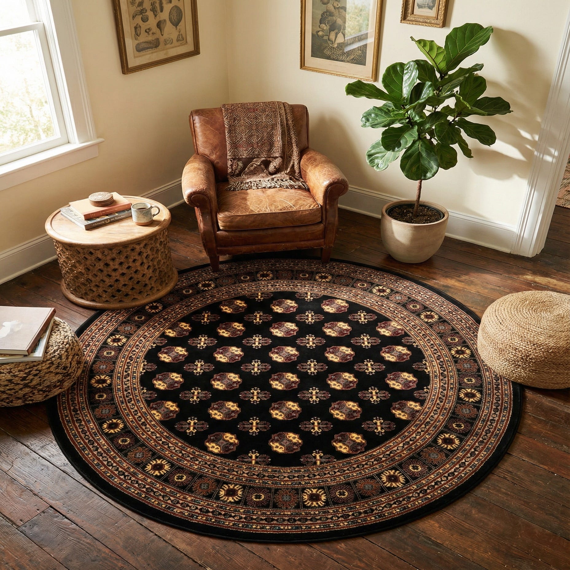 The Bokhara rug's versatile color palette and durable construction make it well-suited for a variety of interior designs, from traditional spaces that celebrate rich, regal tones to more eclectic decors that mix patterns and eras. Use this rug to anchor a seating area, complement dark wood furniture, or contrast with lighter, modern pieces for a dramatic effect. Its round shape is particularly effective in softening the lines of square or rectangular rooms, making it a smart choice for living rooms, studies, or beneath a dining table.