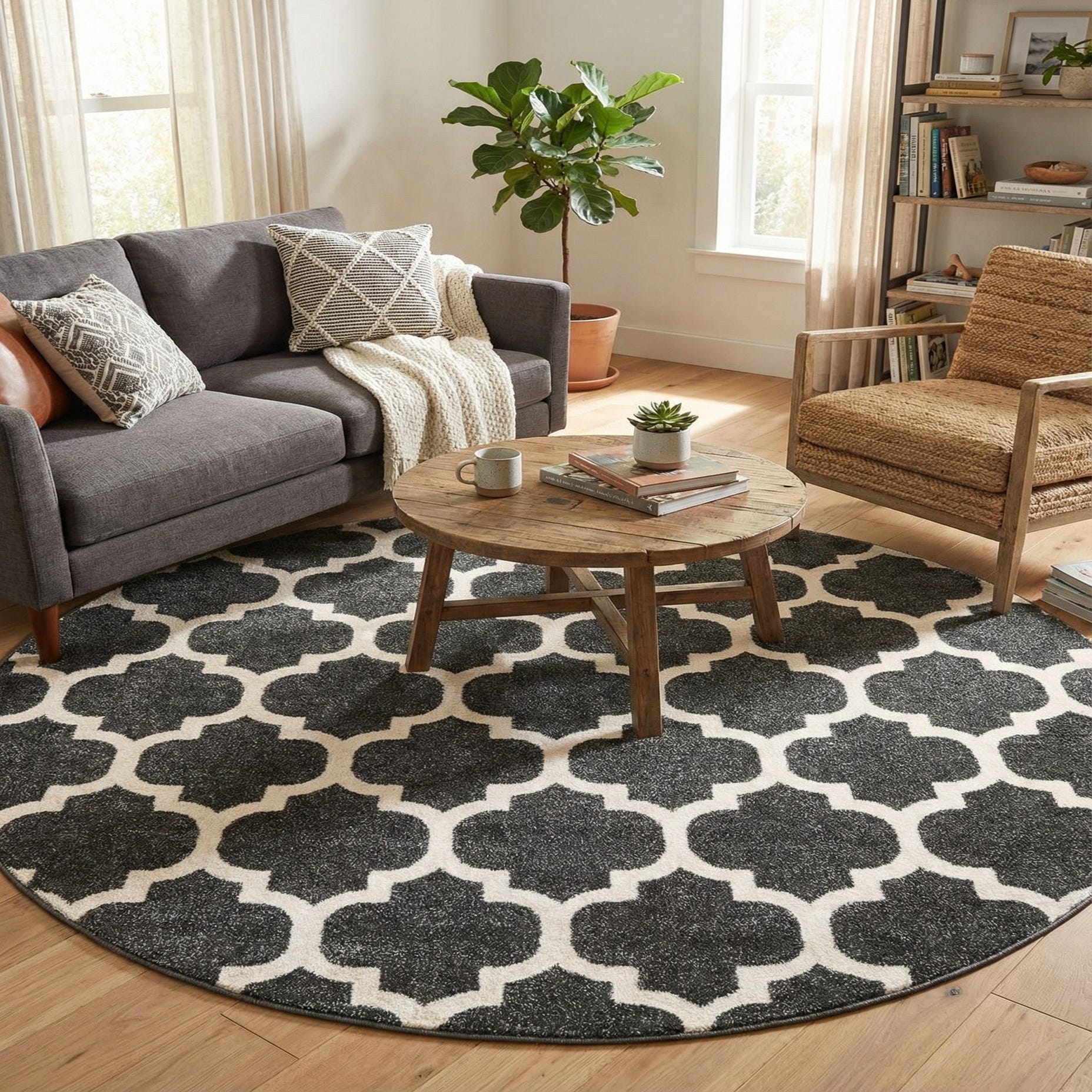 The round shape brings a soft edge to angular furniture and works well beneath a round dining table, in a breakfast nook, or to define a cozy seating area. The high-contrast black and beige palette complements minimalist and contemporary interiors as well as transitional or global-inspired schemes; pair it with warm wood tones and metal accents for an industrial look, or layer it under neutral upholstery to add graphic interest.