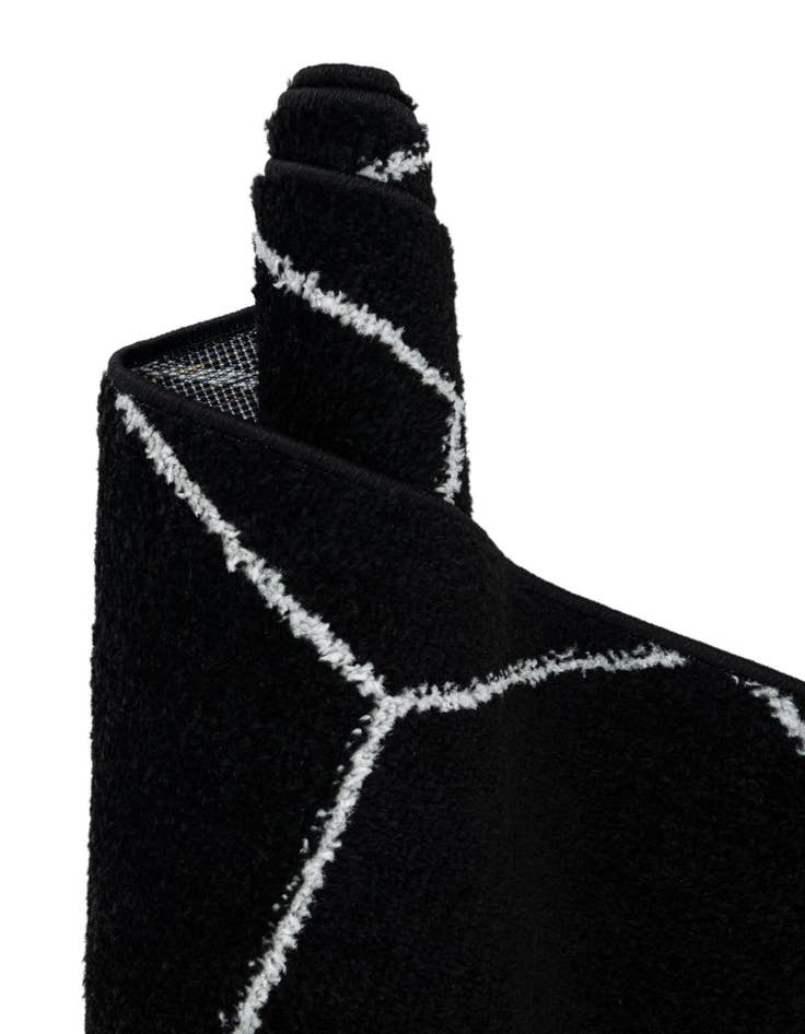 A bold black field provides a dramatic backdrop for a crisp ivory lattice of elongated hexagons and diamond shapes. The geometric pattern is rendered with slightly irregular, hand-drawn lines that add a subtle, organic quality to the graphic design. Machine-made from 100% polypropylene, the rug has a low-to-medium cut pile that feels soft and smooth underfoot while maintaining a clean, defined surface that highlights the contrast between the black ground and ivory pattern.