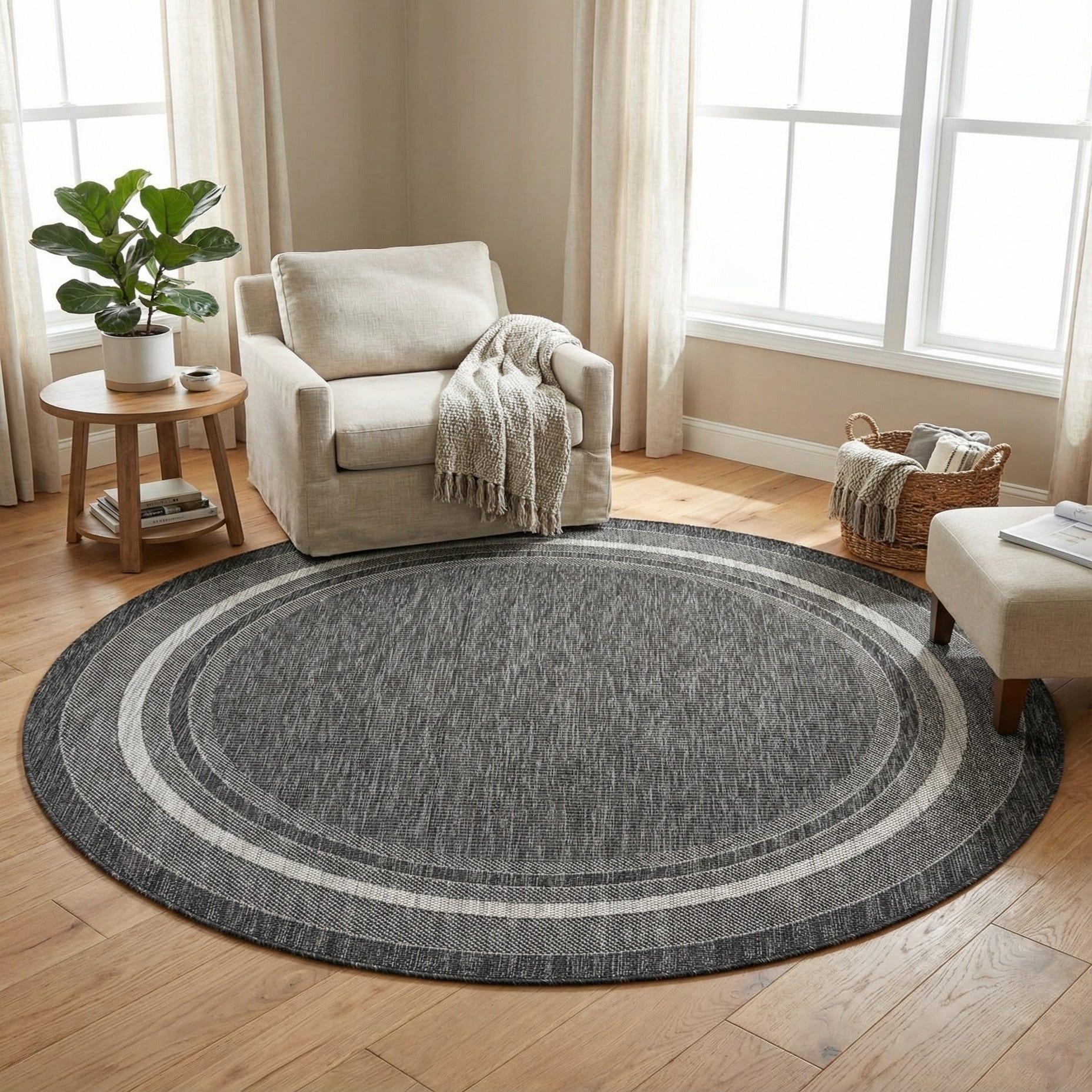 Machine-made from 100% polypropylene, this round outdoor rug has a low-profile, flatwoven surface with a tactile, slightly textured hand. A deep black field provides the backdrop for a clean, concentric border pattern in beige and gray: alternating narrow and wider bands form a framed ring that brings subtle movement without competing with other design elements. The woven construction shows a fine crosshatch detail that gives the surface a linen-like visual texture while remaining smooth underfoot.