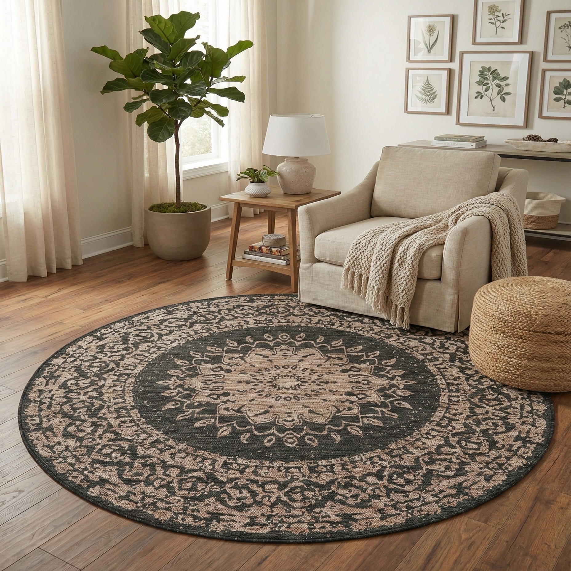 A 6' round black and beige traditional medallion rug with a distressed look, suitable for indoor or outdoor use.