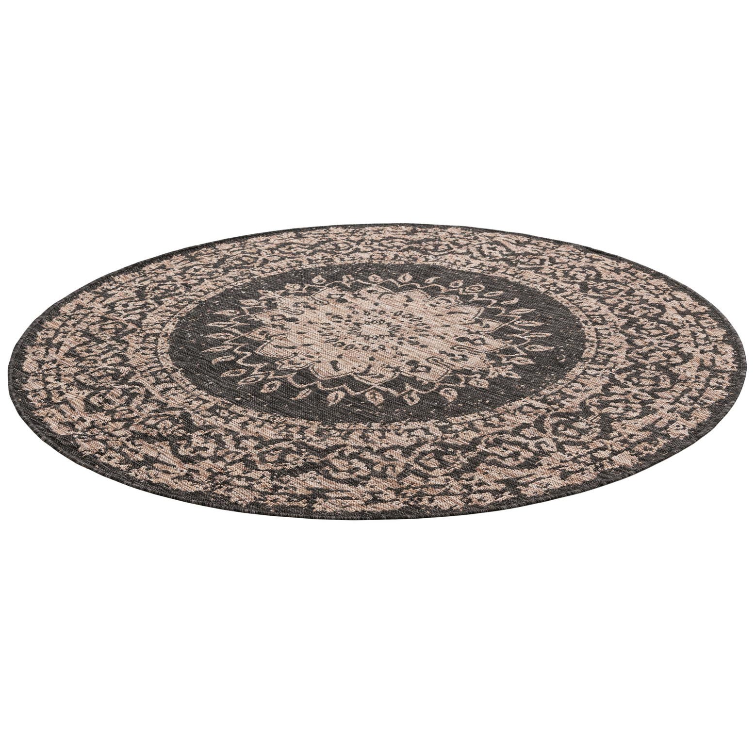 A classic medallion arrangement anchors this round rug, with a floral starburst at the center and layered borders of scrolling arabesques that create a traditional, slightly aged effect. Beige motifs sit boldly against a black background for clear contrast, and the overall pattern reads as timeworn rather than fussy. The surface is a low-pile, tightly woven polypropylene with a faintly ribbed texture that feels firm underfoot while still offering a comfortable hand. Machine-made of 100% polypropylene, the construction delivers consistent pattern definition and reliable performance in active spaces.