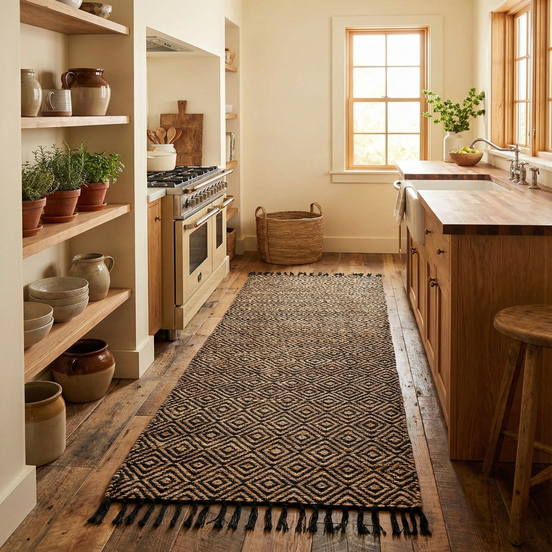 This runner is well suited to narrow spaces where a bold graphic can make an impact: try it in an entryway or hallway, along a galley kitchen, or beneath a console table. Its natural fiber palette complements warm wood floors, matte-black metal accents, leather seating, and layered textiles in neutral or earth tones, making it a versatile choice for modern farmhouse, boho, or contemporary interiors.