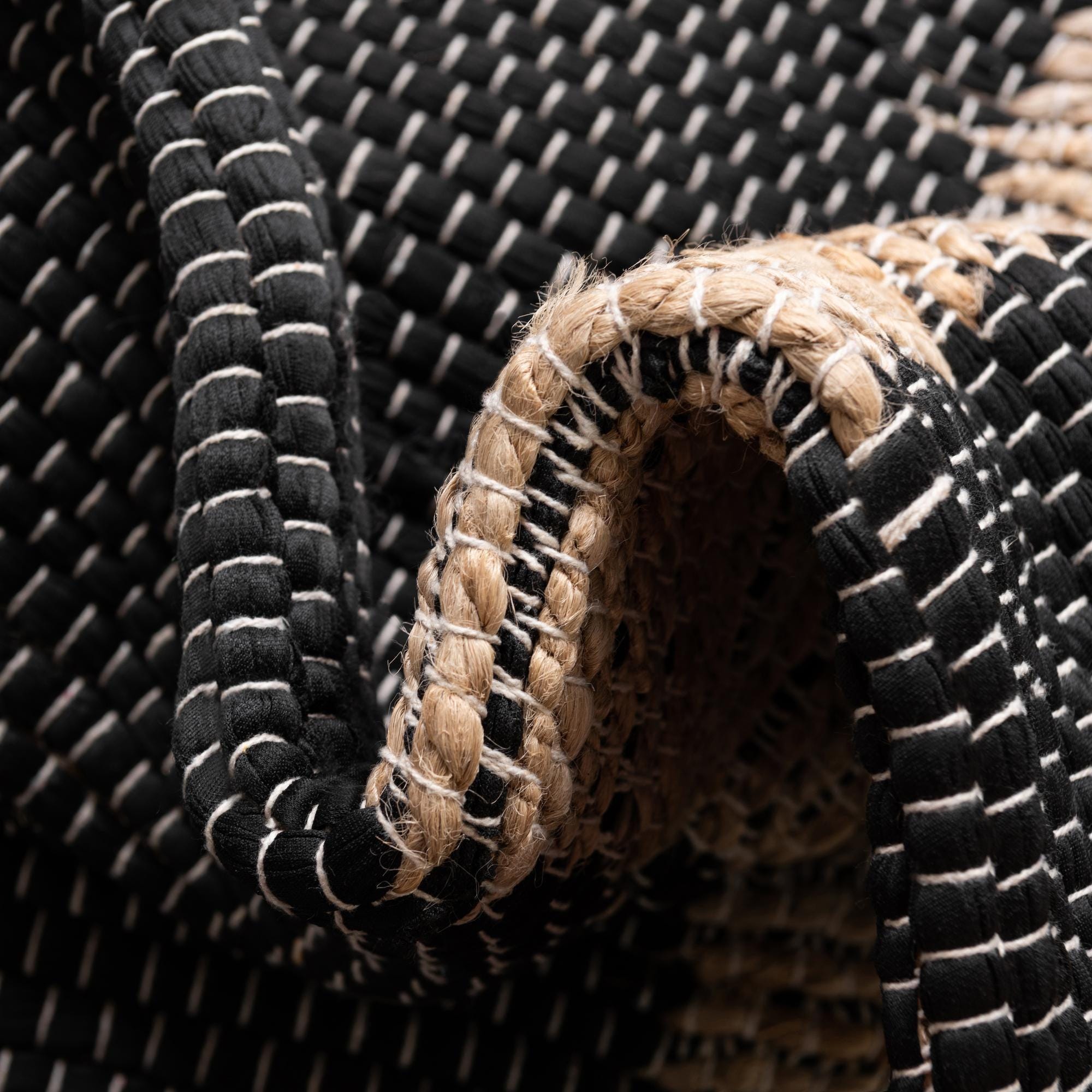 Hand-woven from 60% cotton and 40% jute, this flatwoven runner pairs a deep black ground with a natural jute rectangular border for a clean, graphic look. The tight weave shows off the contrast between the smooth cotton threads and the coarser jute strands, creating a low-profile surface with a tactile, slightly textured feel underfoot. The edges are finished with hand-stitched detailing that reinforces the runner’s linear shape and adds subtle handcrafted character.