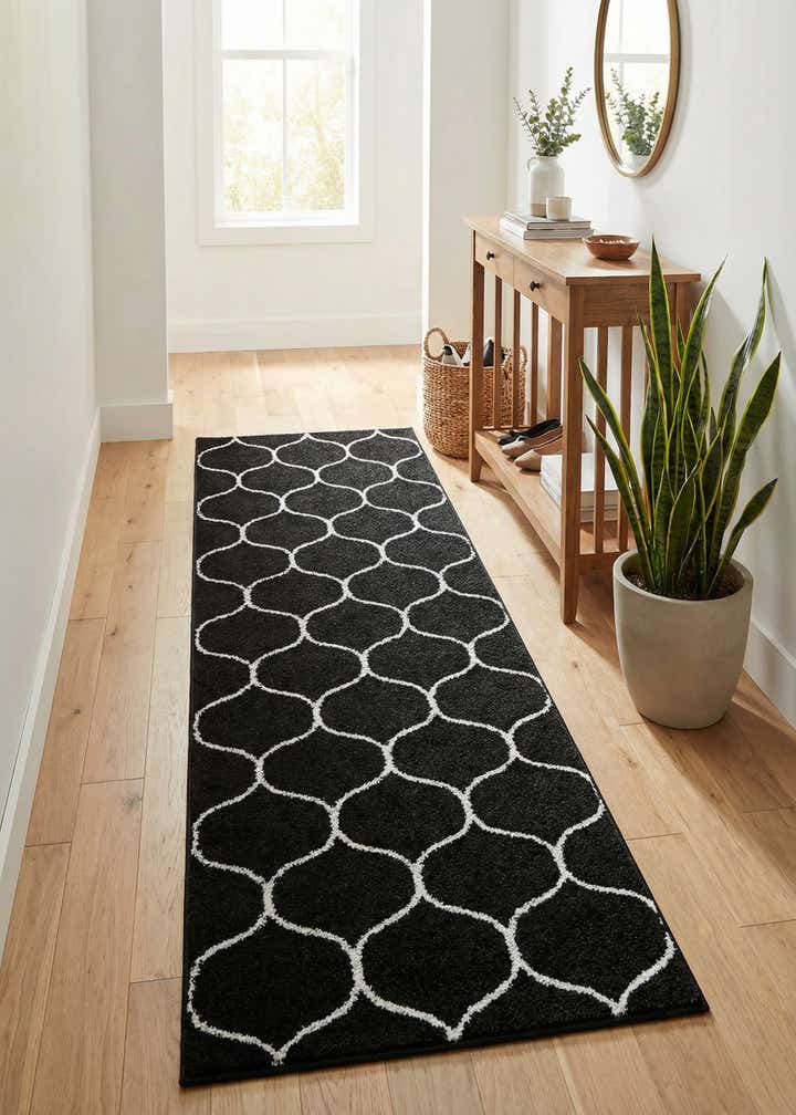 This runner works well in modern, transitional, or Moroccan-inspired spaces and is suited to high-traffic areas like hallways, entryways, or alongside a kitchen island. Pair it with light wood or polished concrete floors to let the contrast pop, or layer it in a monochrome living space for added texture. The black-and-ivory palette also complements neutral furnishings and metallic accents for a refined, grounded look.