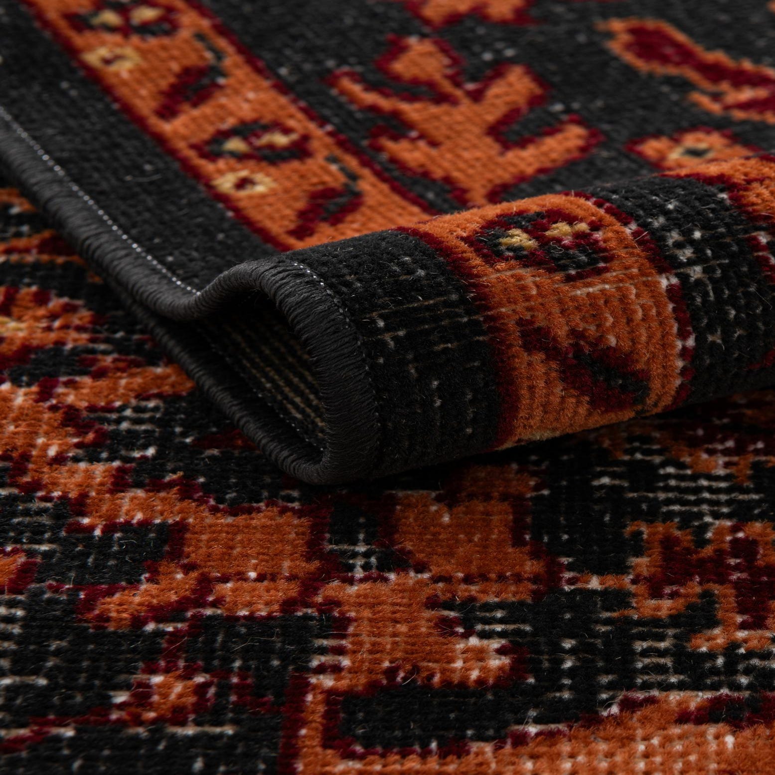 A traditional, vintage-inspired runner with a dense medallion-and-vine pattern rendered in bold black, warm orange and deep red, punctuated by ivory highlights. The black background anchors the design while the layered orange and red motifs create a rich, patterned surface that reads both detailed and rhythmic. Machine-made from 100% polypropylene, the rug has a low-profile pile with a smooth, even texture that showcases the intricate motifs and feels gently cushioned underfoot.