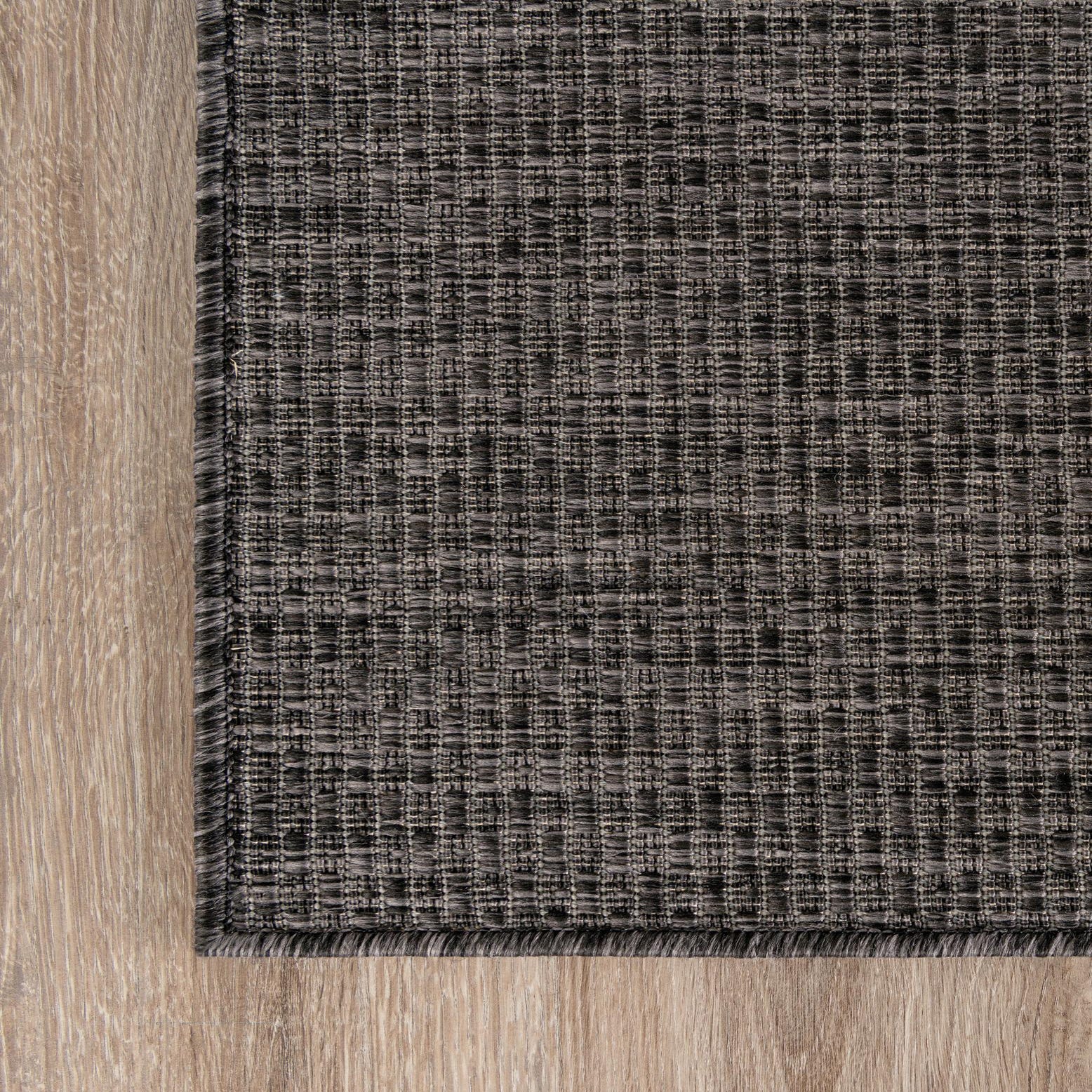 A 6 ft runner rug from the Rugs.com Outdoor Solid collection, featuring a modern black and gray textured flatweave pattern, suitable for indoor or outdoor use.