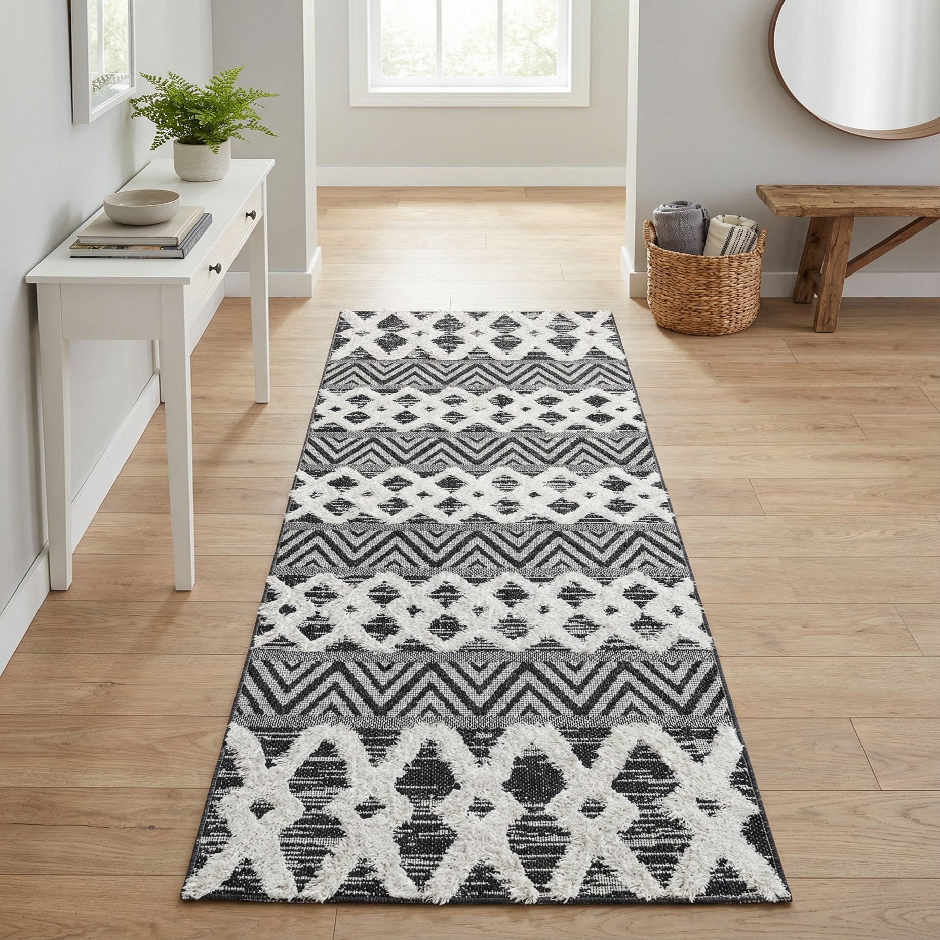 Place this runner in a narrow entry or hallway to define circulation, use it along a galley kitchen or in front of a sink to add warmth underfoot, or layer it in a living room to introduce pattern without color. It pairs naturally with light oak or bleached wood floors, matte black metal accents, and neutral upholstery — fitting well with modern farmhouse, Scandinavian, bohemian, or monochrome contemporary interiors.