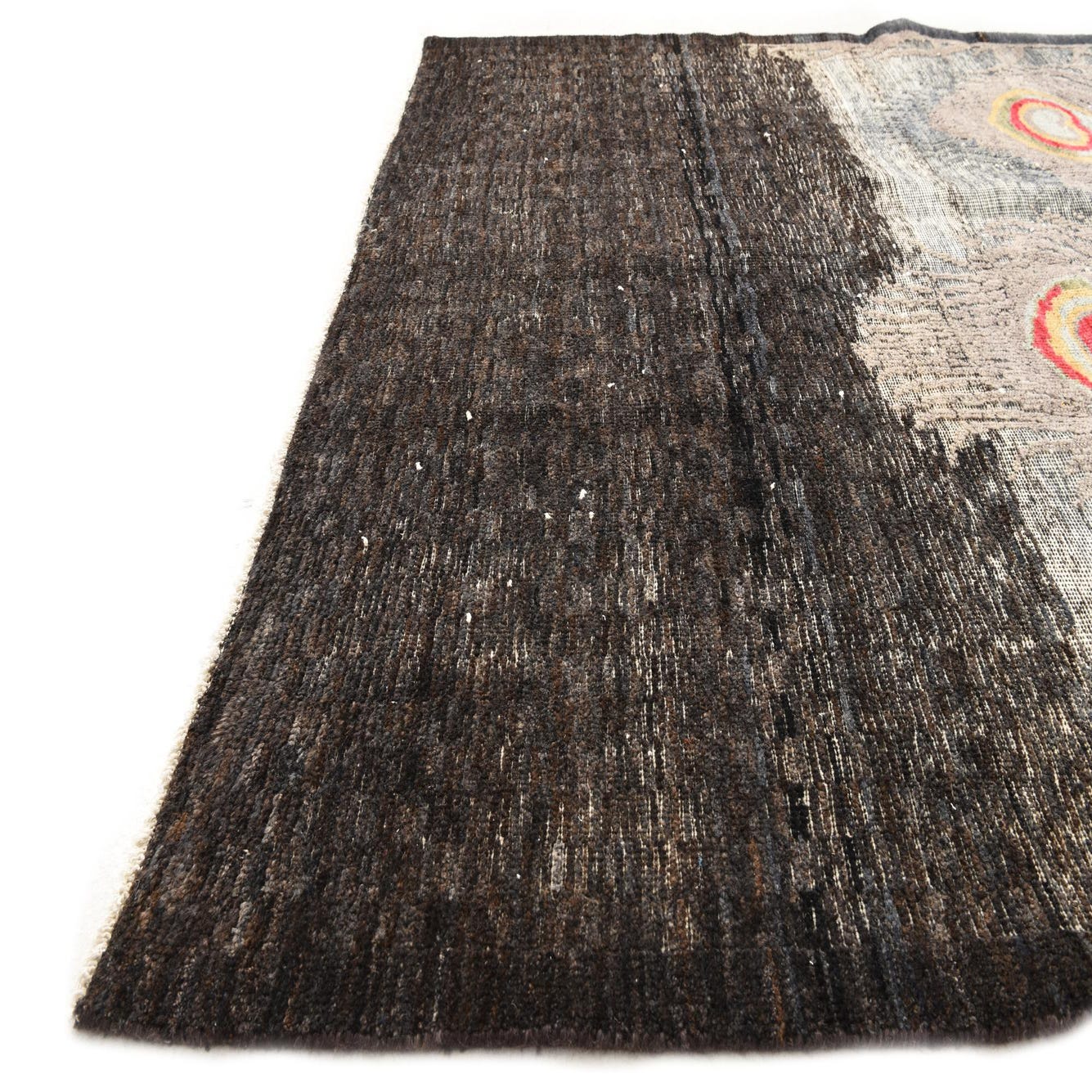 The Darya Collection presents a 6 ft square hand-knotted rug crafted from 100% wool, boasting a distinctive and engaging design. The rug is characterized by its richly saturated black background that provides a striking contrast to an array of colors including brown, yellow, red, olive, light blue, and ivory. Upon this dramatic backdrop, the rug features an intricate pattern reminiscent of peacock feathers or abstract florals with a hint of an Art Deco influence, introducing a sense of movement and exotic charm.