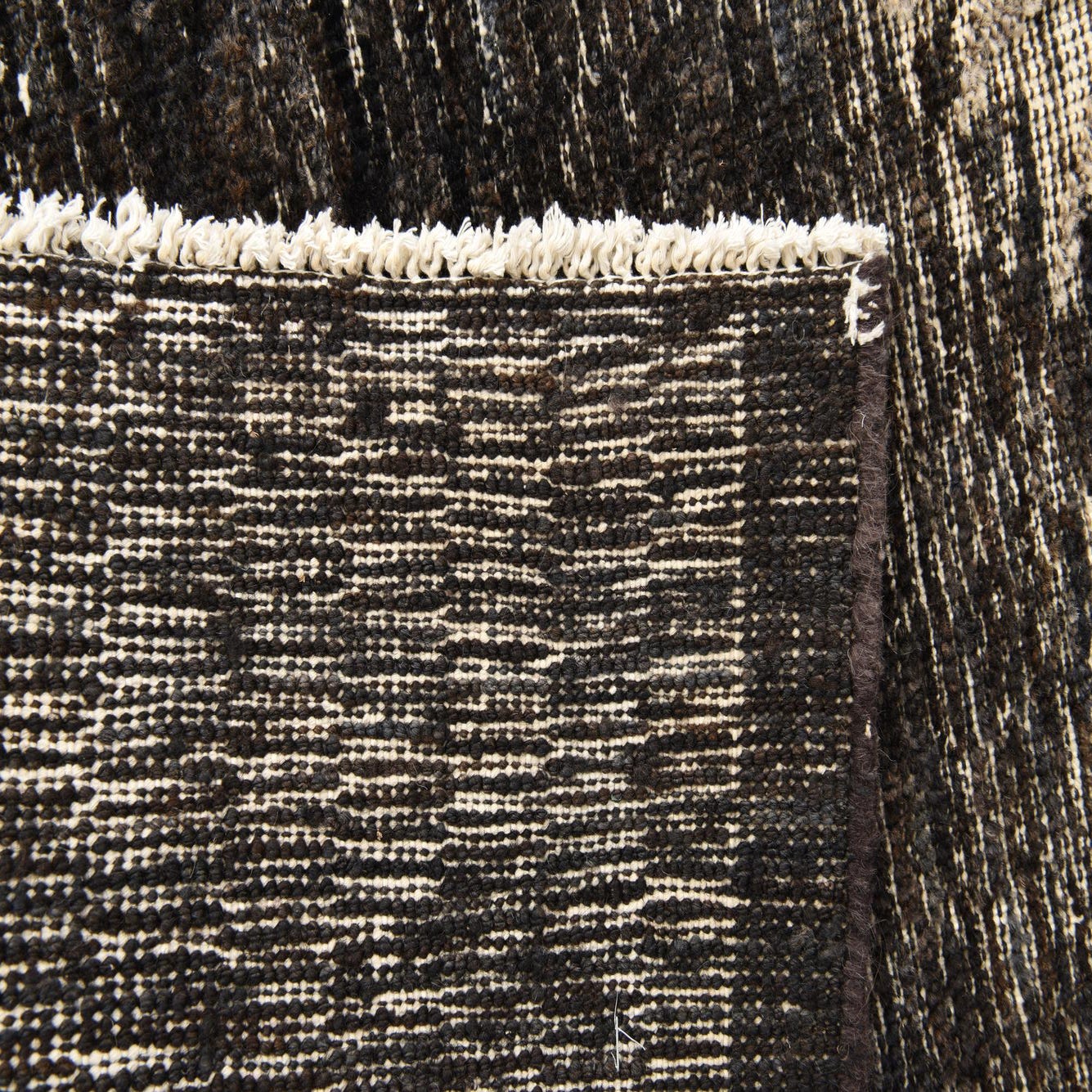 The unique color palette integrates both warmth and depth, offering versatility for various stylistic preferences. The texture of the wool is dense and substantial, indicative of its handcrafted quality and adds both comfort and durability to the piece. Fringed edges complete the traditional aesthetic, bringing an added element of texture and dimension to the rug's overall appearance.