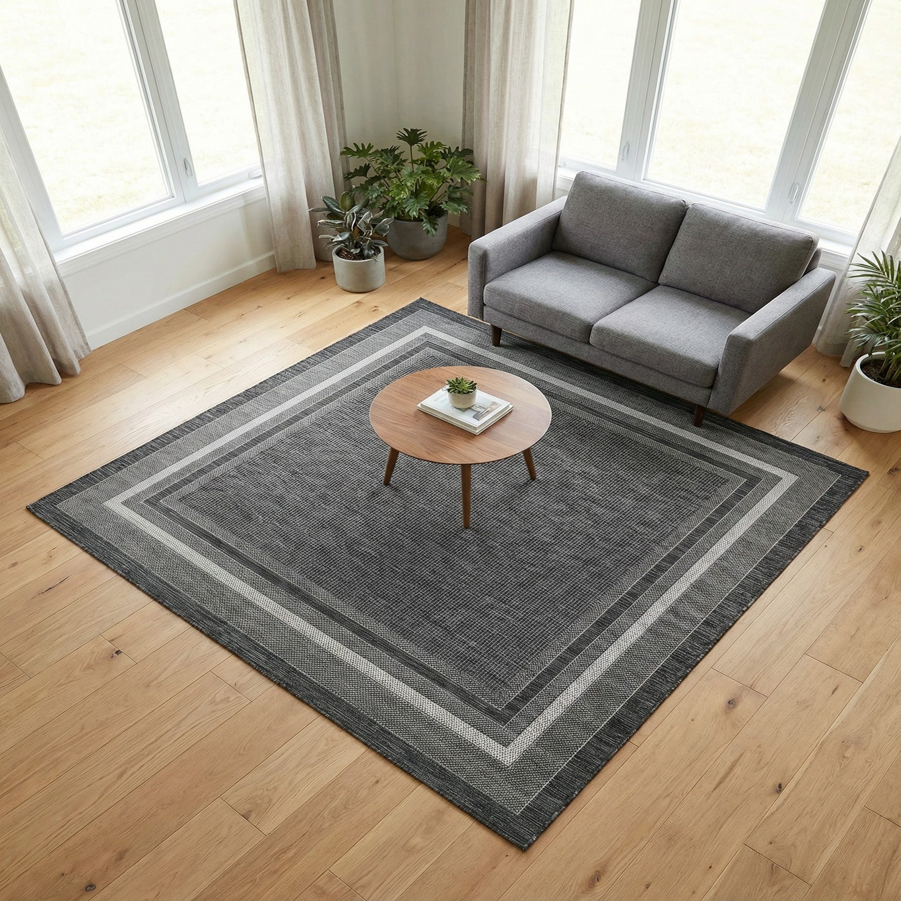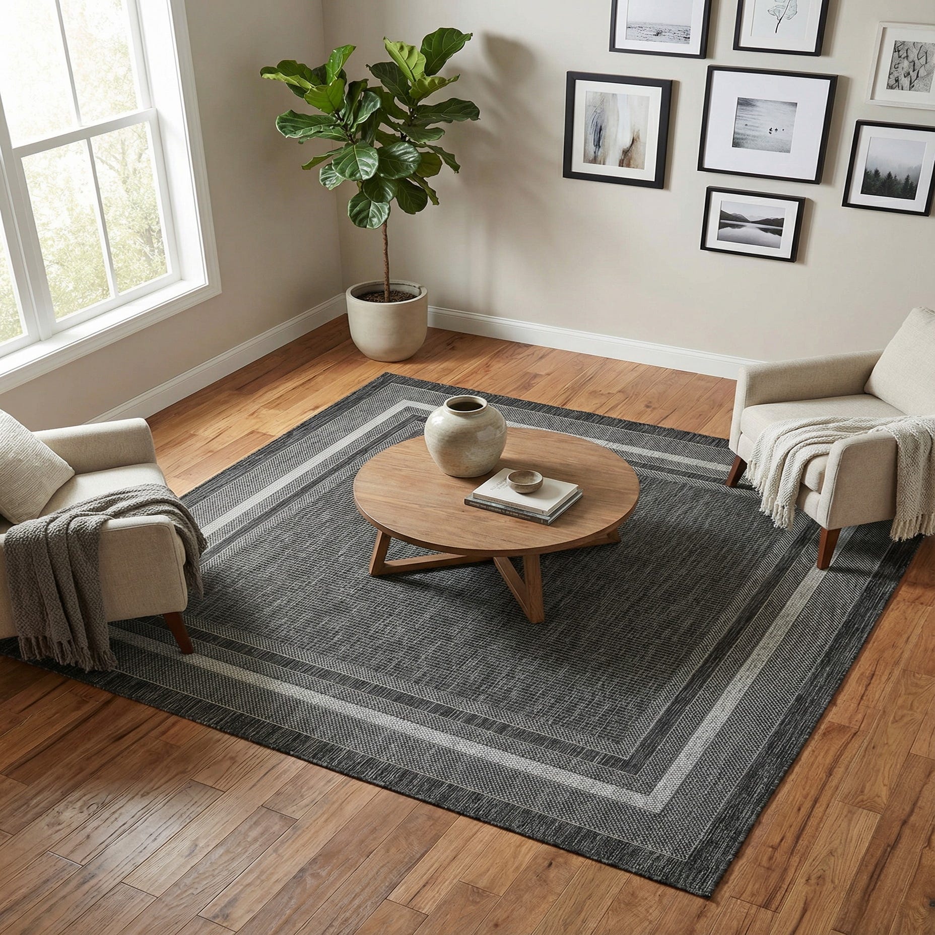 This rug works well on covered patios and sunrooms as easily as it does in an entryway or beneath a compact dining set. Pair it with metal or wicker patio furniture for a contemporary outdoor dining area, or set it under a monochrome sofa and natural wood accents to anchor a minimalist living room. Its neutral palette of black, beige, and gray adapts to coastal, modern, and transitional schemes, giving rooms a defined, grounded presence without overwhelming other elements.