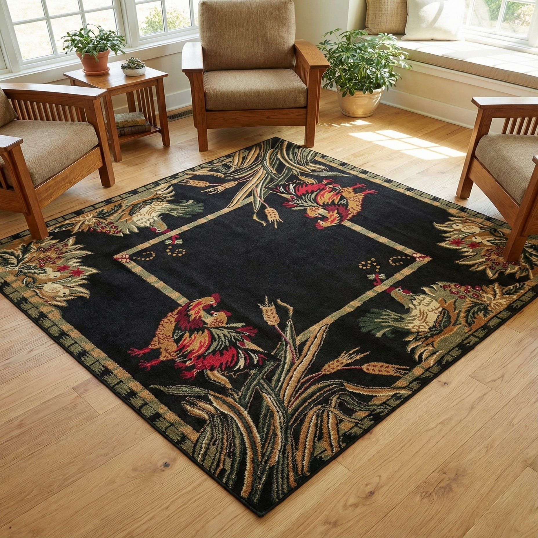 Machine-made from 100% polypropylene, the rug has a low, dense pile that feels smooth underfoot and holds the color contrasts crisply. The rich reds and rust tones pop against the black background while cream and tan highlights add warmth. Place it in a farmhouse kitchen or breakfast nook, beneath a square or round dining table, or anchor a cozy seating area with warm wood furniture and leather accents. It also pairs well with olive or green textiles and vintage painted cabinetry when you want a collected, country-inspired look.