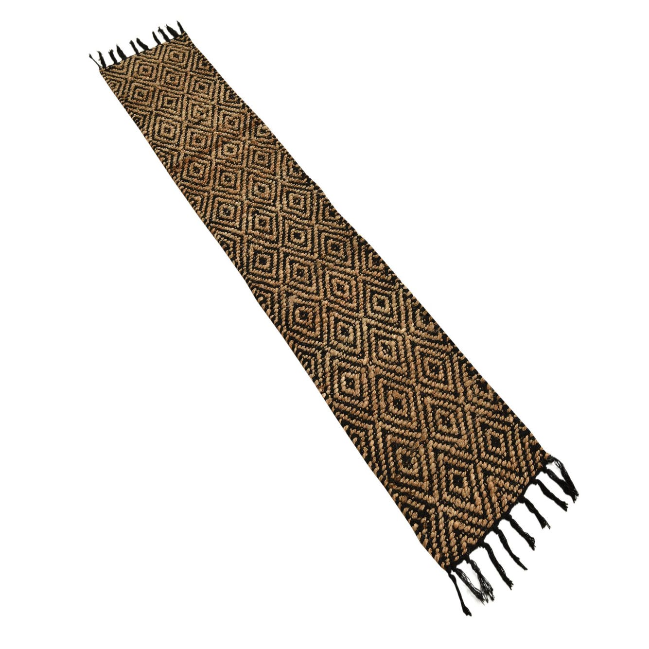 A repeating diamond motif is braided into natural jute cords set against a solid black background, creating a bold two-tone pattern with a handcrafted look. The braided construction gives the surface a raised, knotted texture you can feel under your fingers, and short black tassels finish both ends for a casual, finished edge. Hand woven of 60% cotton and 40% jute, the mix balances the soft give of cotton with the rustic grain of jute for visible texture and subtle tonal variation.