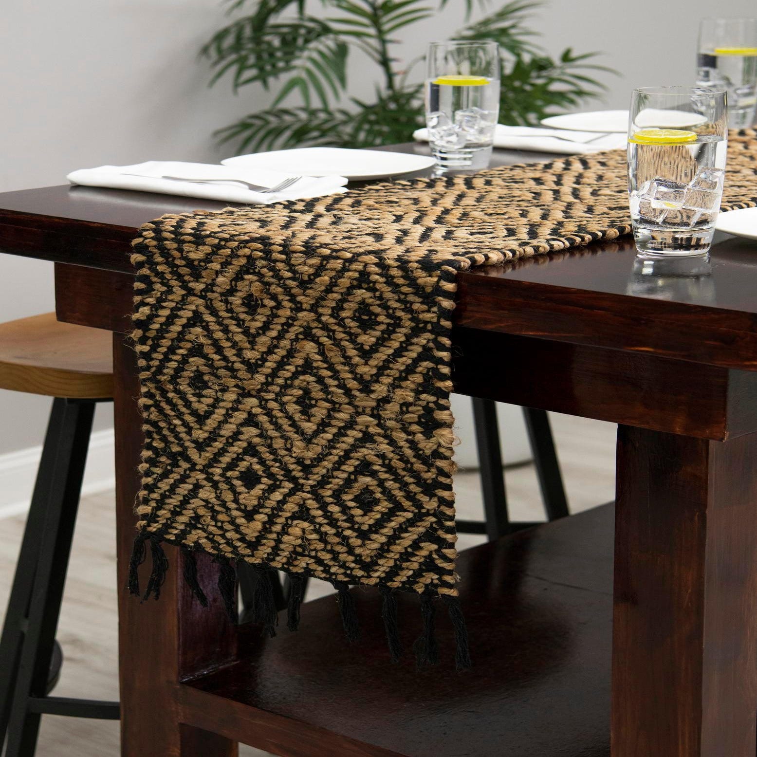 A repeating diamond motif is braided into natural jute cords set against a solid black background, creating a bold two-tone pattern with a handcrafted look. The braided construction gives the surface a raised, knotted texture you can feel under your fingers, and short black tassels finish both ends for a casual, finished edge. Hand woven of 60% cotton and 40% jute, the mix balances the soft give of cotton with the rustic grain of jute for visible texture and subtle tonal variation.
