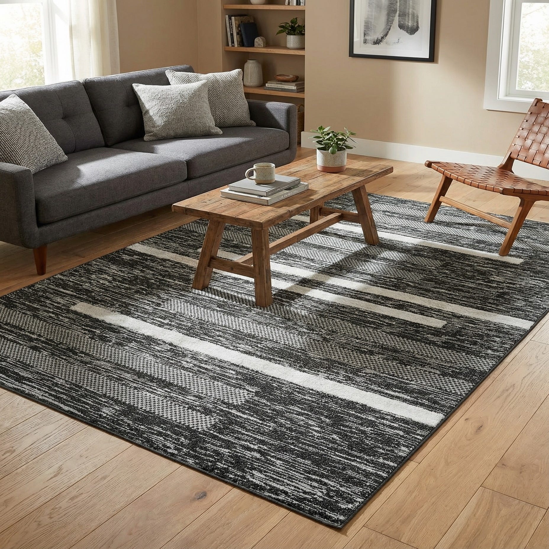A 6x9 rectangular black and white modern rug with horizontal stripes and textured patterns, ideal for a living room.