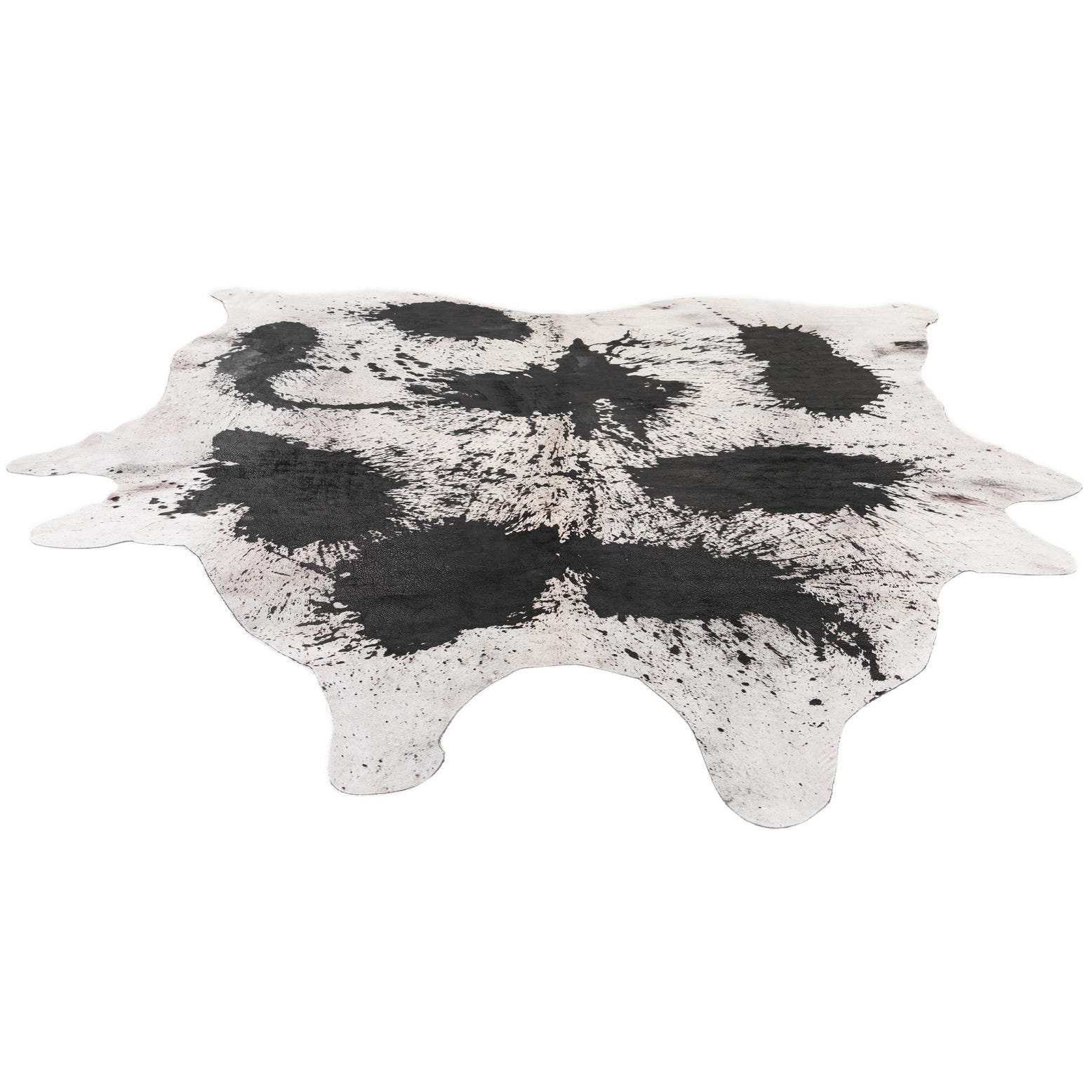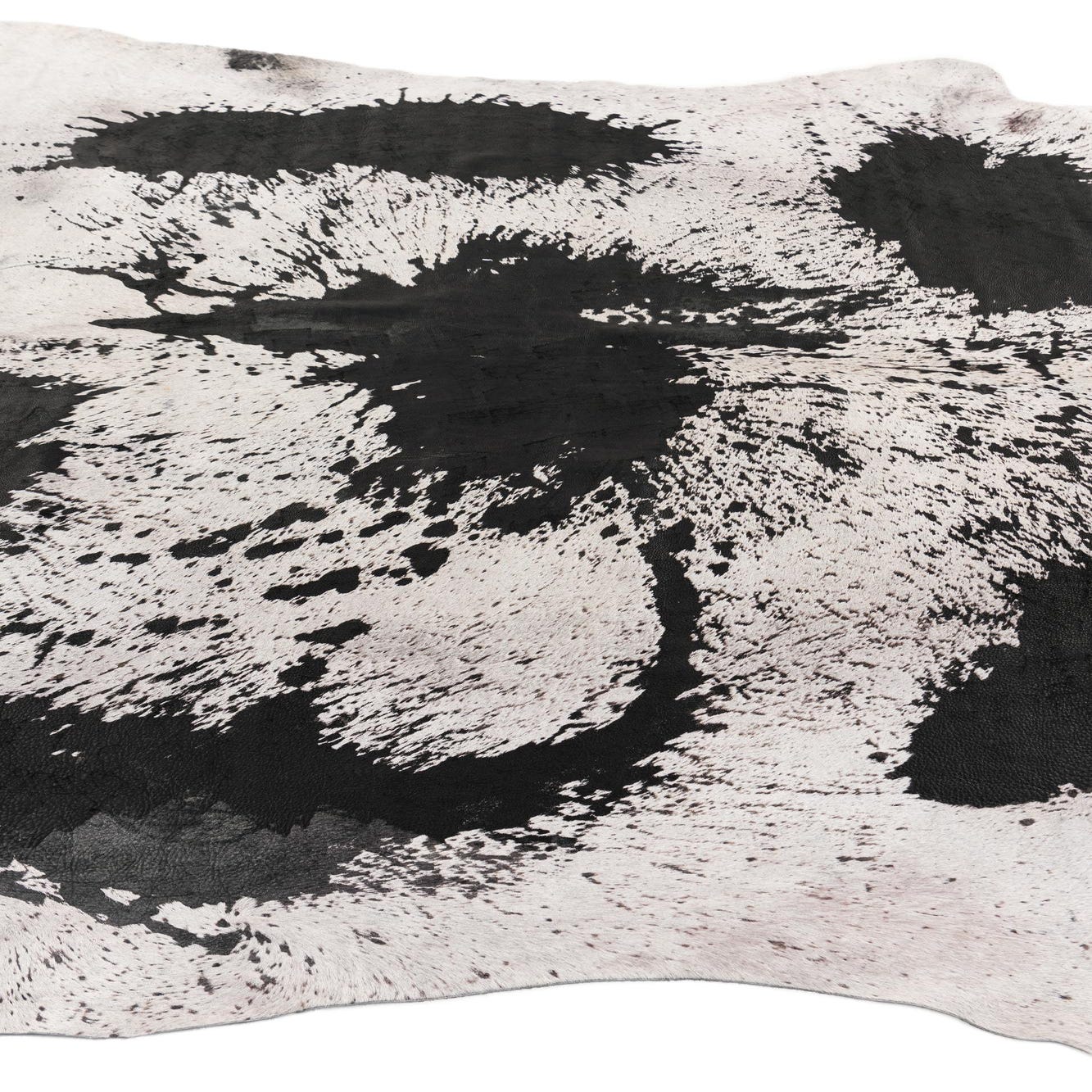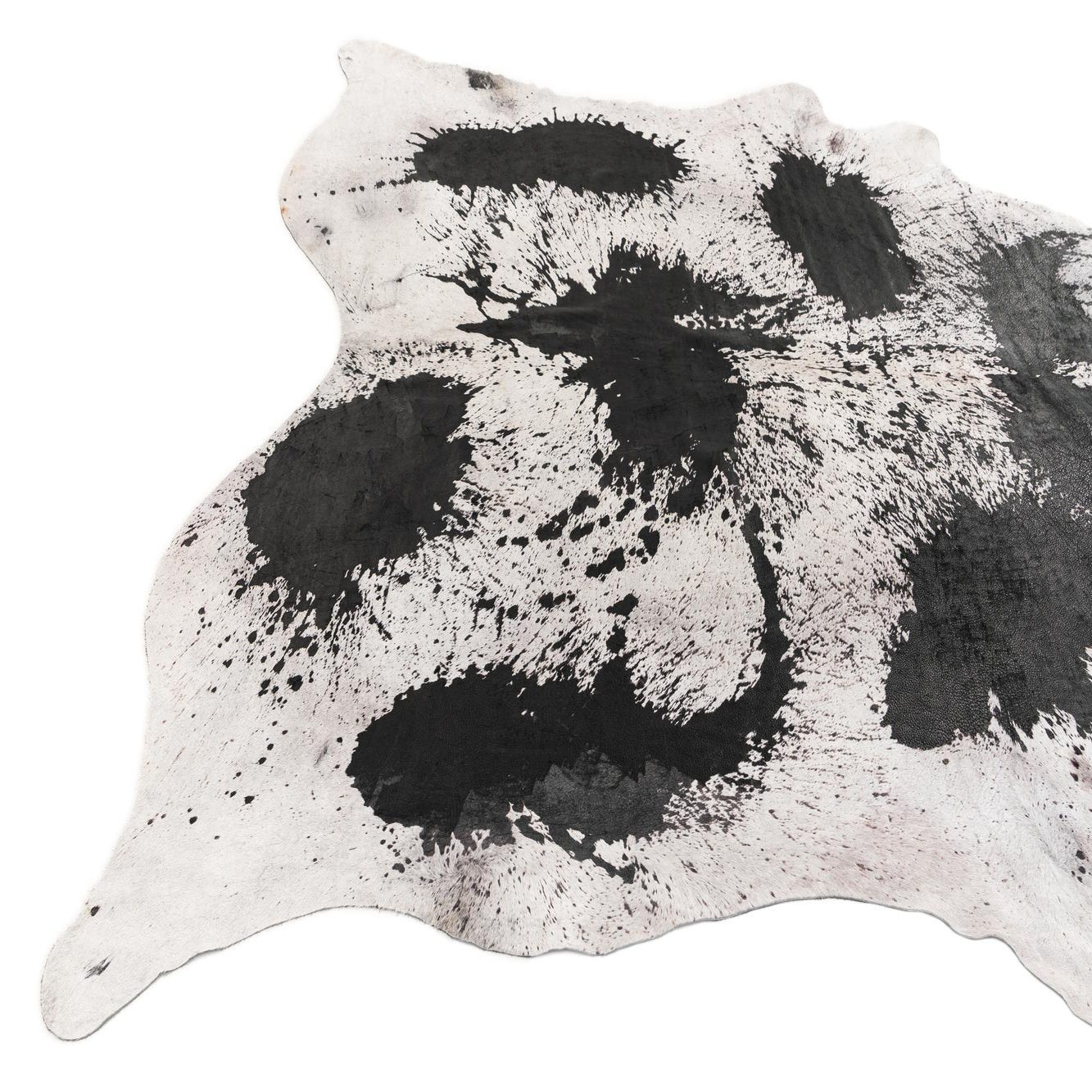 A 6x9 rectangular cowhide rug with a modern black splatter paint pattern on a white background.