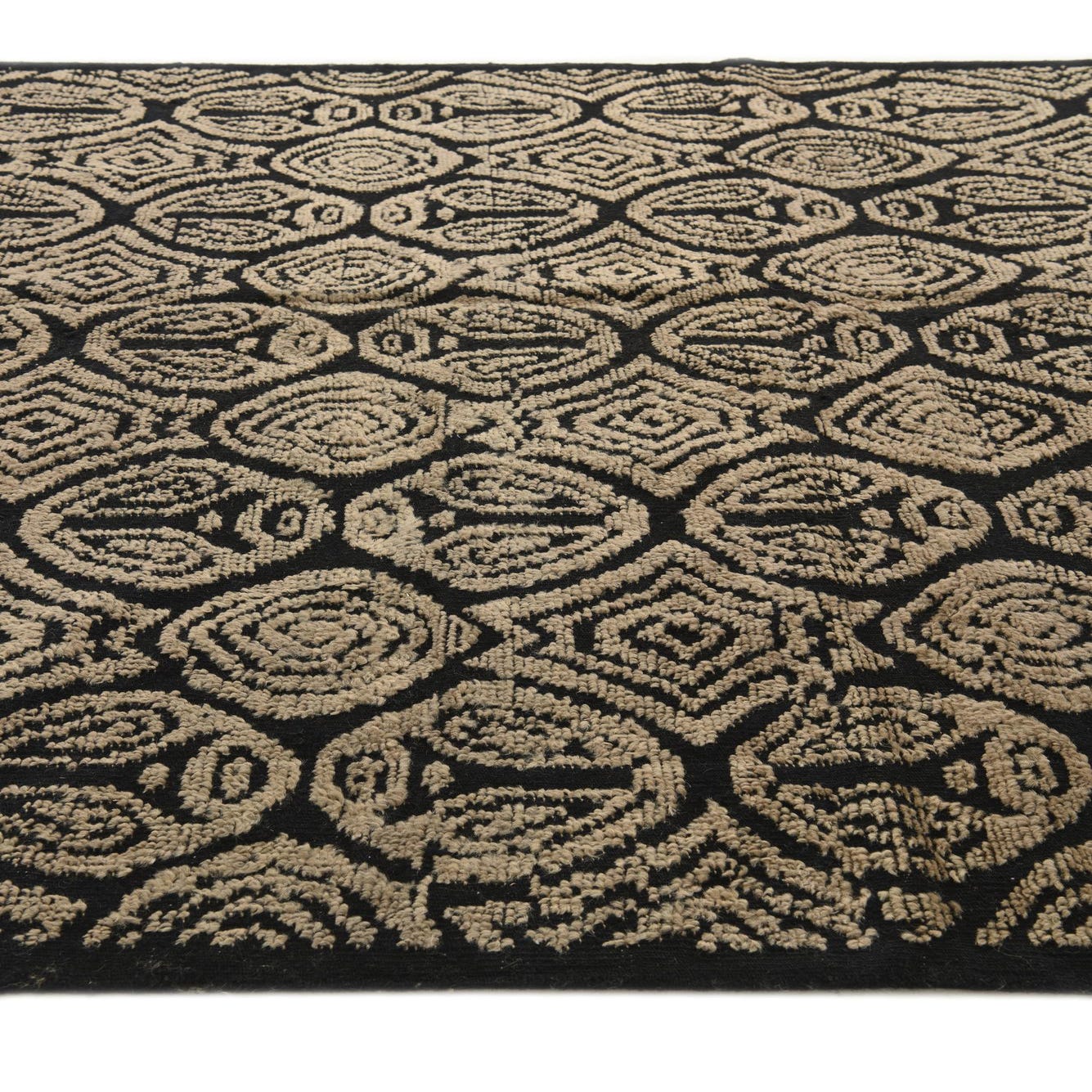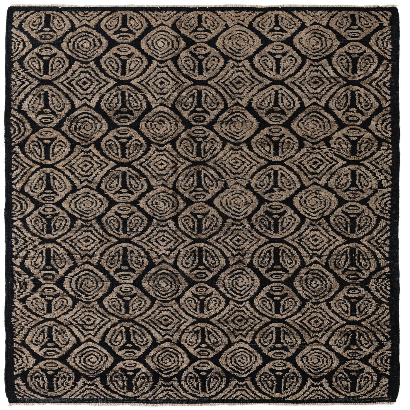 Hand-knotted of 100% wool, this rug pairs a deep black ground with a repeating brown motif of concentric spirals and stylized medallions set in a regular grid. The design balances organic, almost hand-drawn circles with geometric lozenges and small diamond accents, giving the surface steady rhythm and a layered visual texture. The wool pile feels warm and slightly dense underfoot, with subtle knot-height variation that creates a tactile contrast between the raised pattern and the darker background.