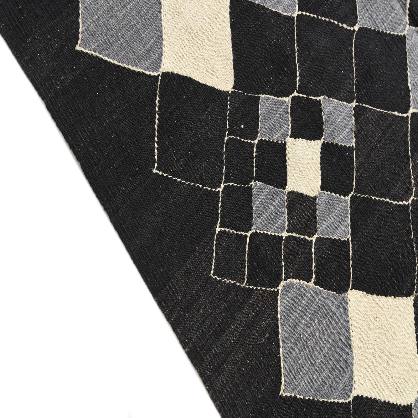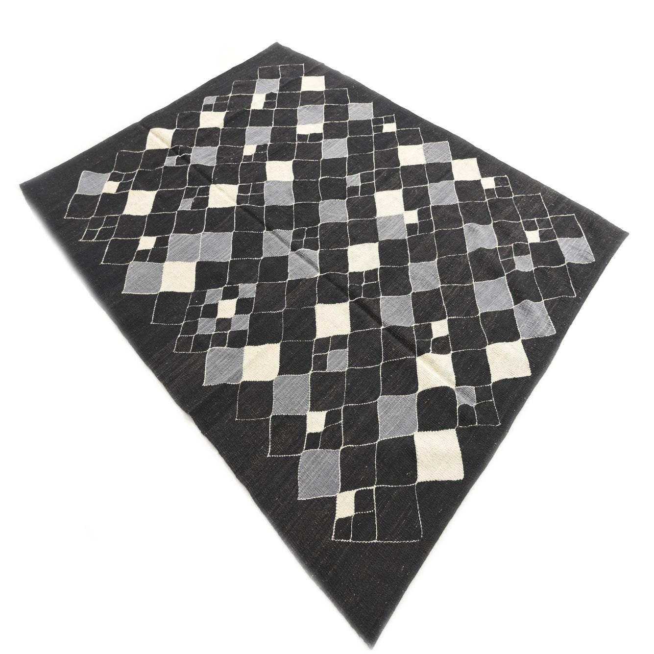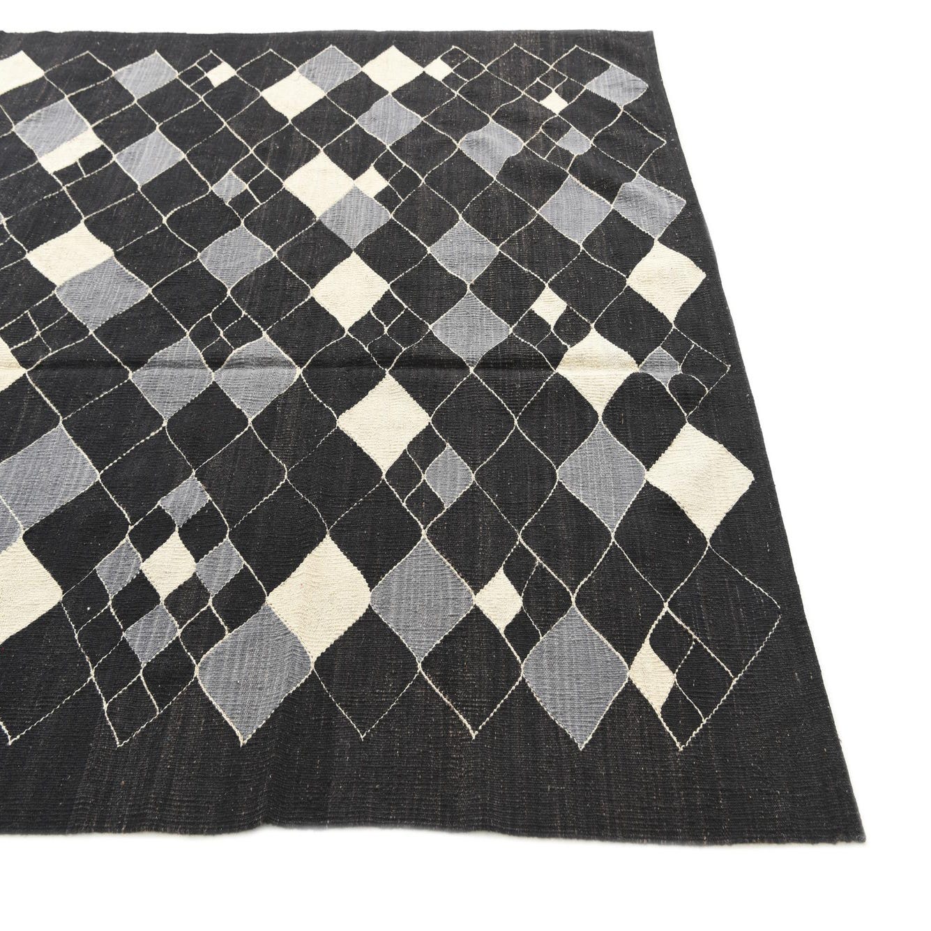 A deep black ground provides a bold backdrop for an open lattice of ivory lines that form a grid of diamonds and smaller geometric shapes. Select diamonds are filled with soft gray and ivory fields, creating a balanced, rhythmic pattern that reads modern yet handcrafted. Hand-woven from 100% wool in a flatweave construction, the surface feels tactile and slightly nubby underfoot, with a low profile that lays neatly in a room while showing the subtle texture and color variation of natural wool.