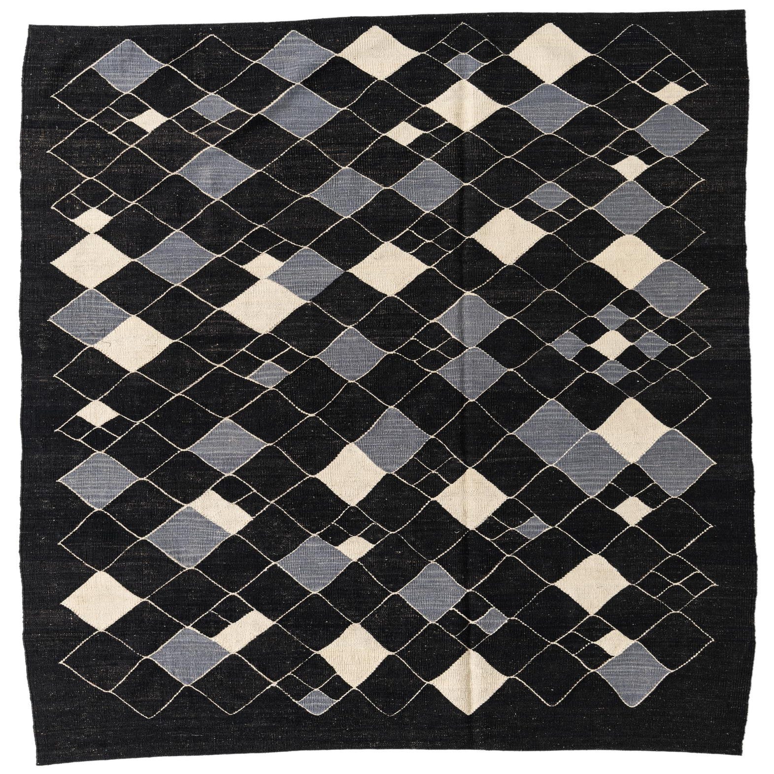 A 6x9 rectangular black wool flatweave rug with a modern tribal diamond pattern in varying shades of black, grey, and cream.