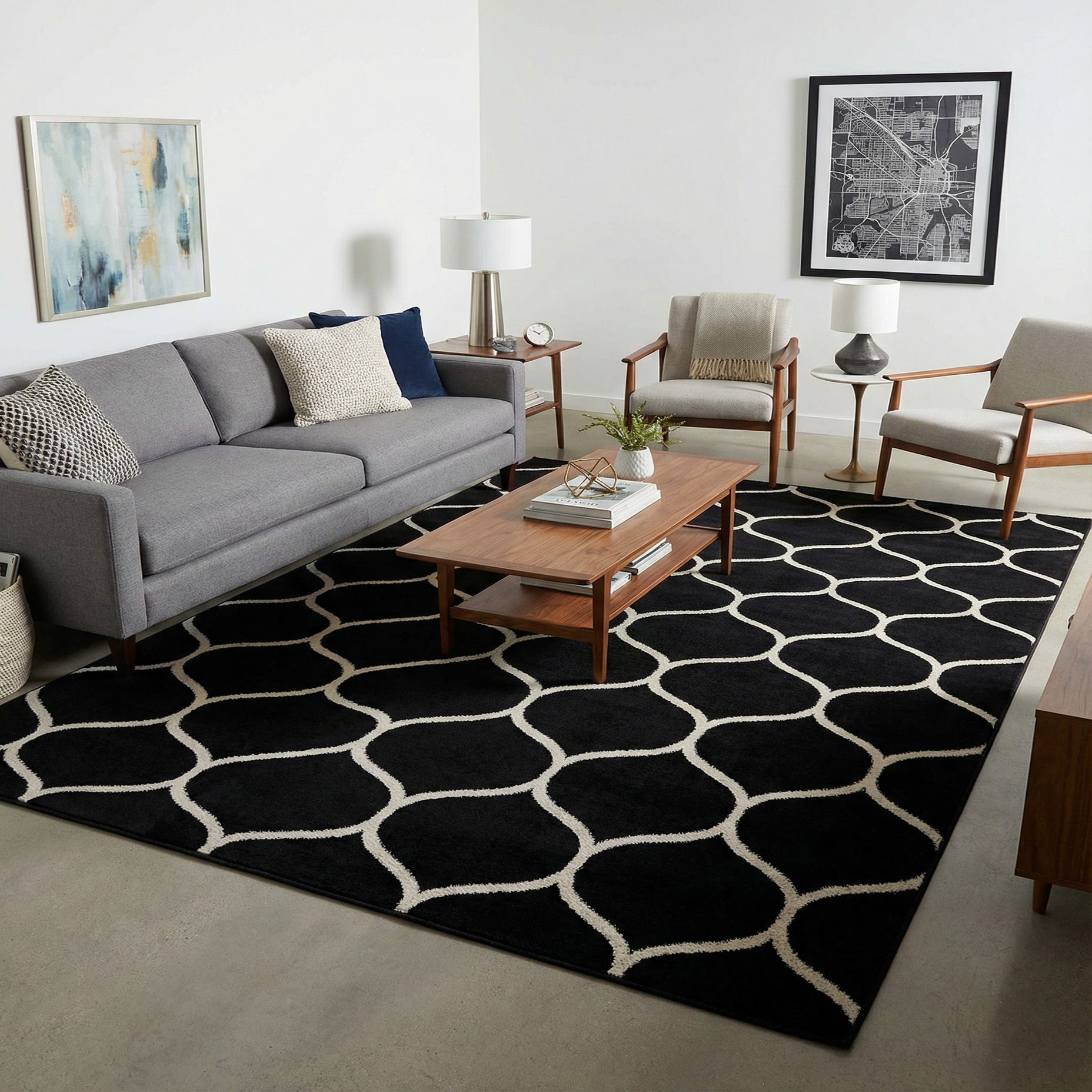The Lattice Frieze Collection offers a 6x9 area rug defined by its crisp, bold lattice pattern. The design, composed of clean ivory lines, stands out against the rug's rich black background, creating a striking visual contrast. Thanks to its 100% polypropylene construction, the rug offers a soft yet durable texture that can withstand high-traffic areas, and it promises ease of maintenance with its stain-resistant and shed-free properties.