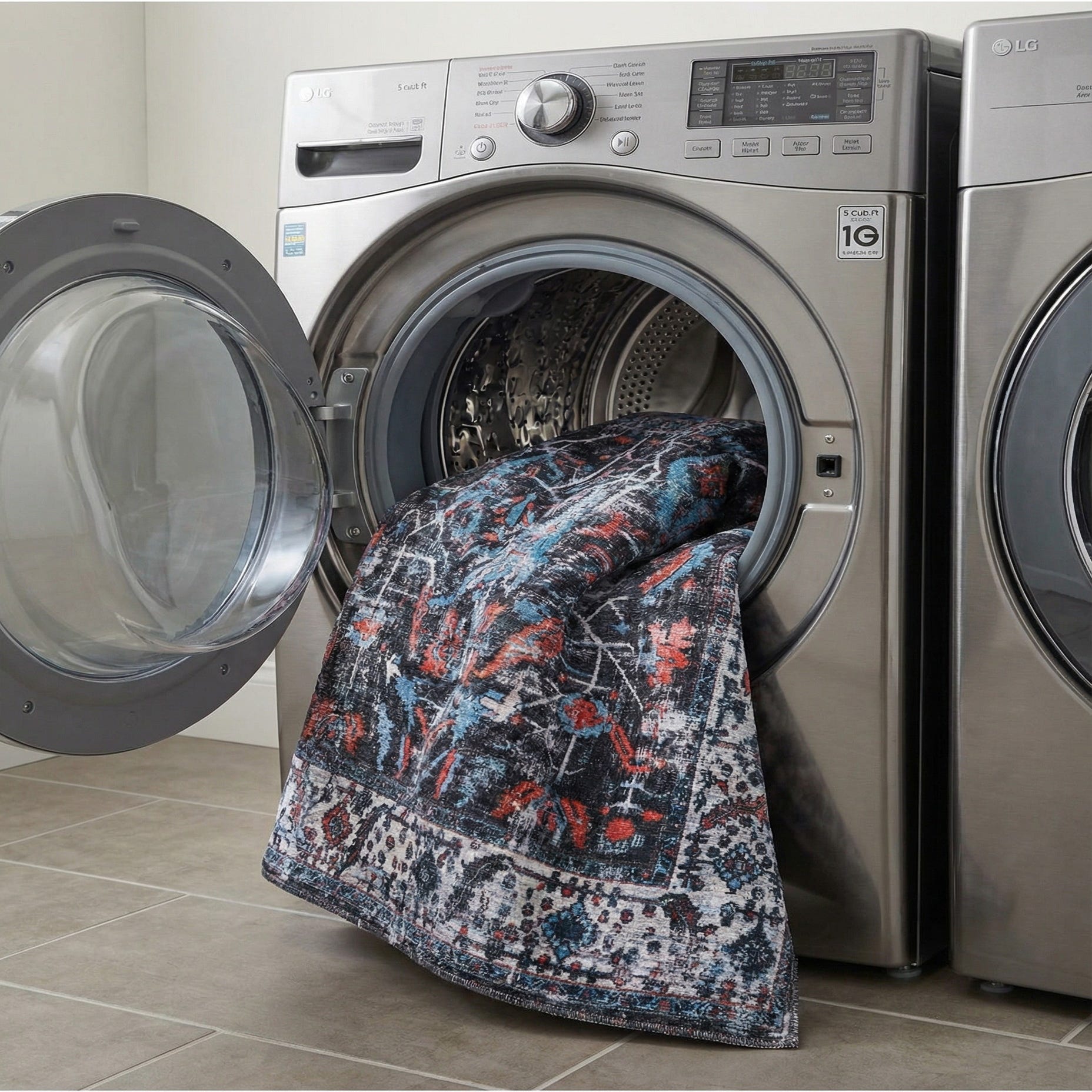 Primary color is Black. Colors in this rug include: Black, Blue, Gray, Ivory, Light Blue, Red, Peach.