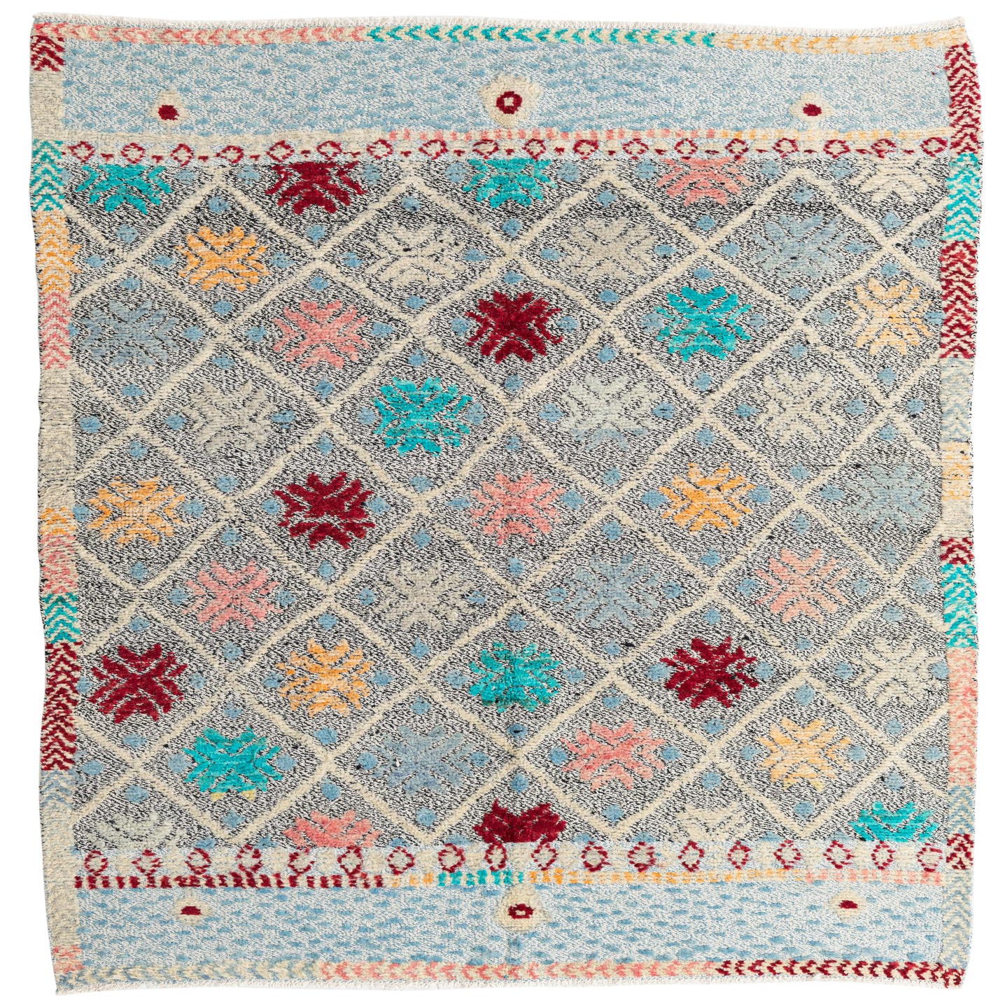 Primary color is Black. Colors in this rug include: Black, Blue, Gray, Orange, Red, Turquoise, Pink.